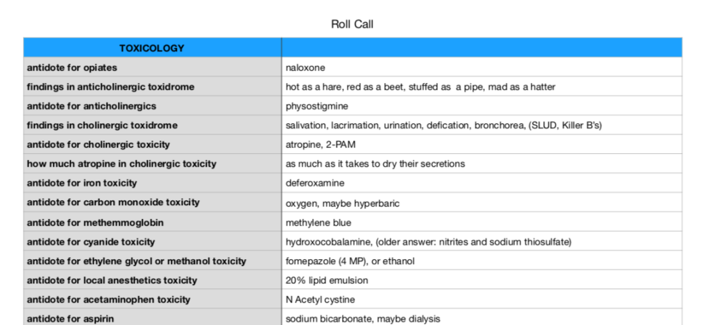 At the beginning of resident conference each week, we run through a list of common problems you might in encounter in the ED. It’s ‘open book,’ but is supposed to go really quickly – the whole list should take less than 10 minutes. Here is that list – the “roll call.” At this point we have 2 lists: one has general medicince / toxicology items, the other has EKG tidbits. We will alternate these every month or so and may add another one with antibiotics or whatever else seems to fit the format. Get familiar with it. These are things you will use for the rest of your life.