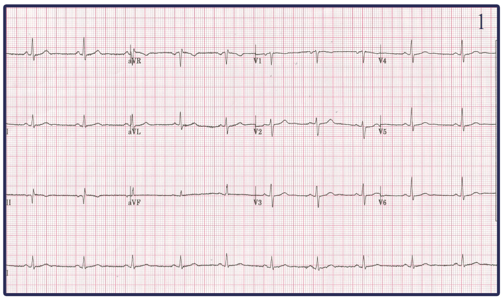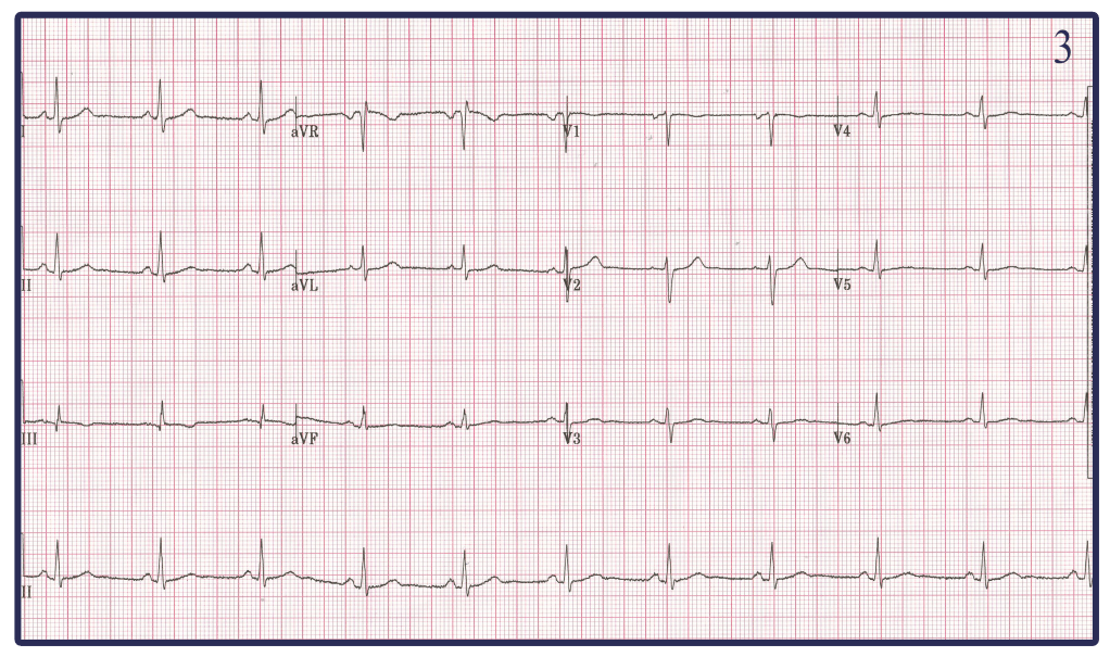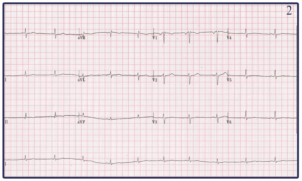 -Both EKG 1 and 2 are more of a mystery to me. Honestly looking at EKG 2 and it appearing to be low voltage I would have assumed this to be caused by someone Obese. However I happen to know this 41 year old EM Physician (beauty is in the eye of the beholder) and would not consider him Obese. My best guess is that one of the leads in EKG 1 and EKG 2 was exchanged with the negative terminal RL changing the morphology of not only the Limb leads but also the chest leads in both.
