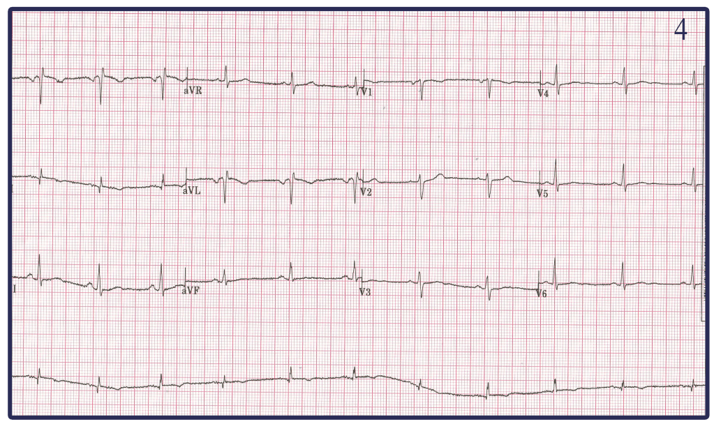 -EKG 4 looks like a reversal in the RA and LA leads causing leads II and III to switch places as well as leads aVR and aVL to switch places when compared to the normal EKG 3.