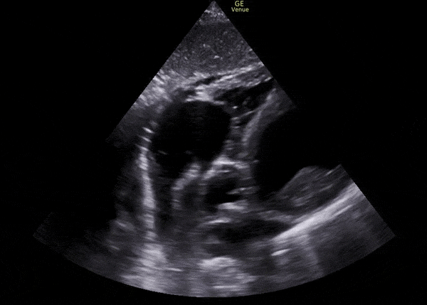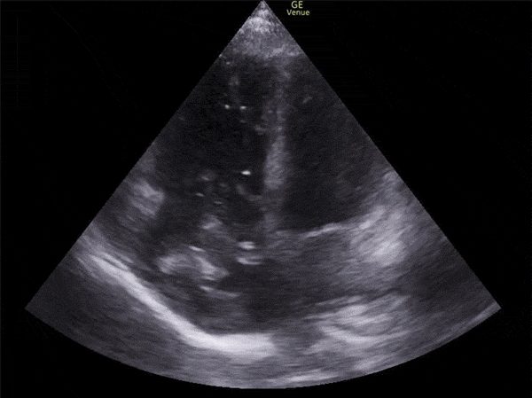 The following two images show clot moving back and forth between the right atrium and the right ventricle. These are free-floating and are often referred to as thrombus-in-transit or clot-in-transit. Unlike mural thrombi these do not form in the heart itself but rather have embolized from a venous thrombus. As the right side of the heart empties by way of the pulmonary artery, these are destined to become pulmonary emboli. The mortality rate of this finding is very high, usually said to be greater than 25%. If you find this, decisions will have to be made about an attempt of embolectomy, anti-coagulation, or thrombolytic therapy.