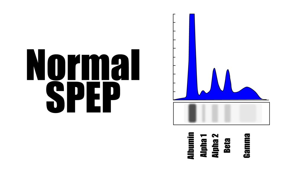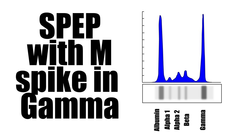 The non-albumin clusters are collectively referred to as “serum globulins.” Immunoglobulins fall into the gamma cluster. The SPEP of a patient with multiple myeloma would show a large spike in the gamma region – the so called “M spike” (M for monoclonal). When you consider that multiple myeloma results from clones of a single plasma cell secreting a protein that is visible in the gamma cluster on SPEP, it becomes clear why it is referred to as a “monoclonal gammopathy.”