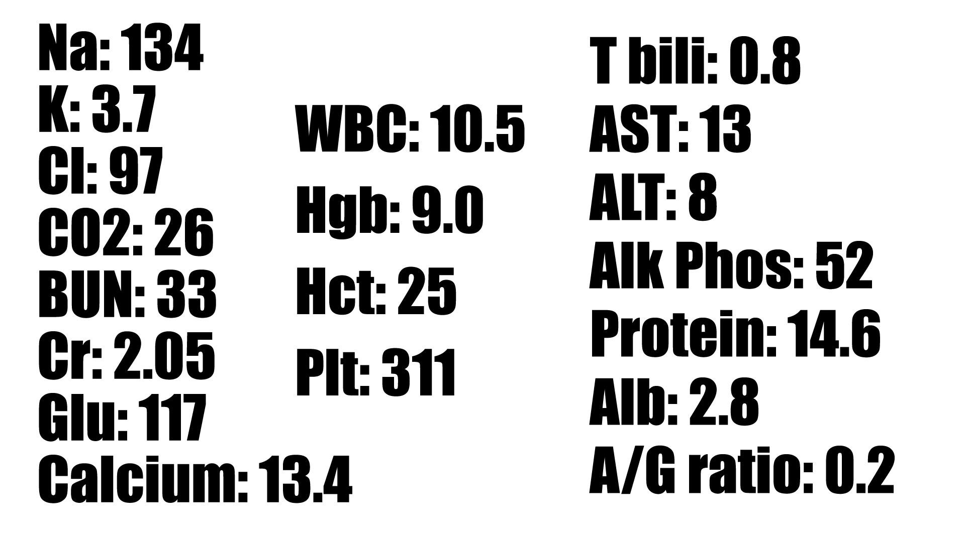 The real finding is the protein. Under normal circumstances, albumin makes up the majority of the serum protein. In this case, however, notice that the total protein is very high, and the albumin is low. That means there must be some protein that is present causing the total to be so much higher than the albumin. That brings up the question alluded to at the outset: