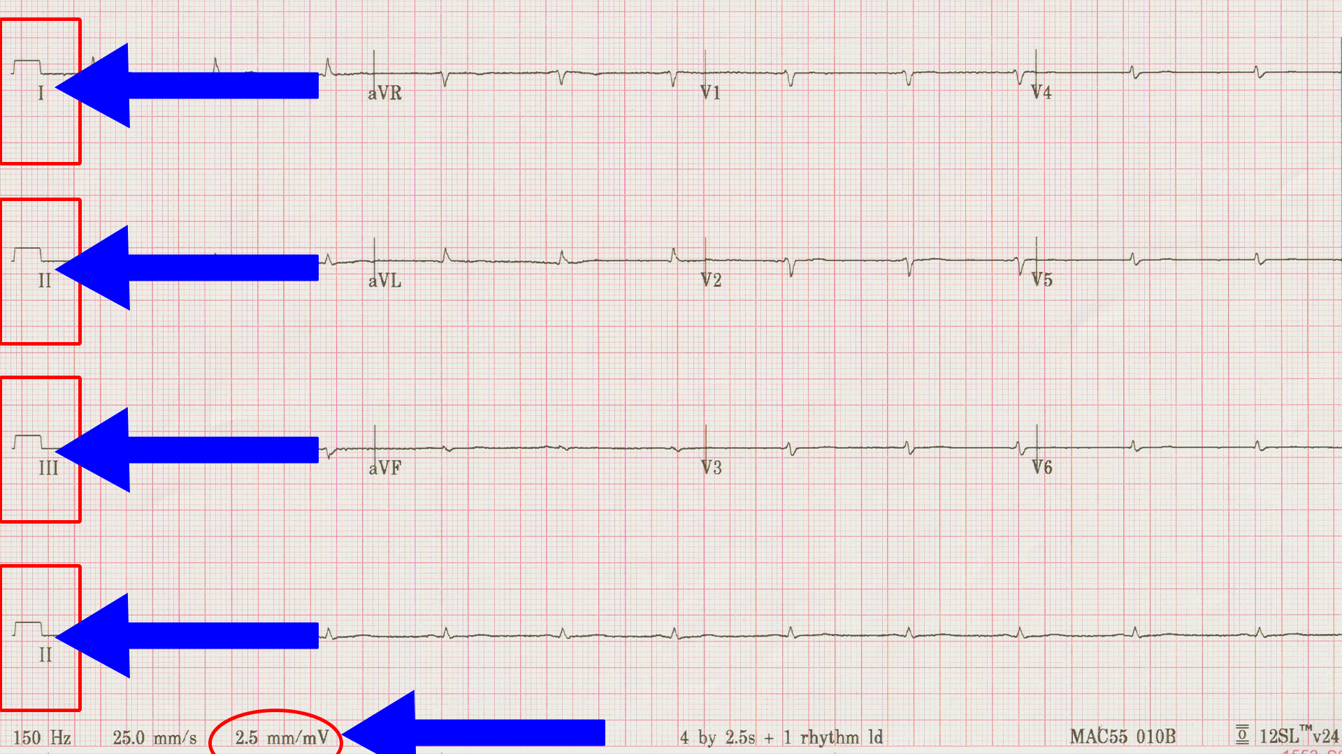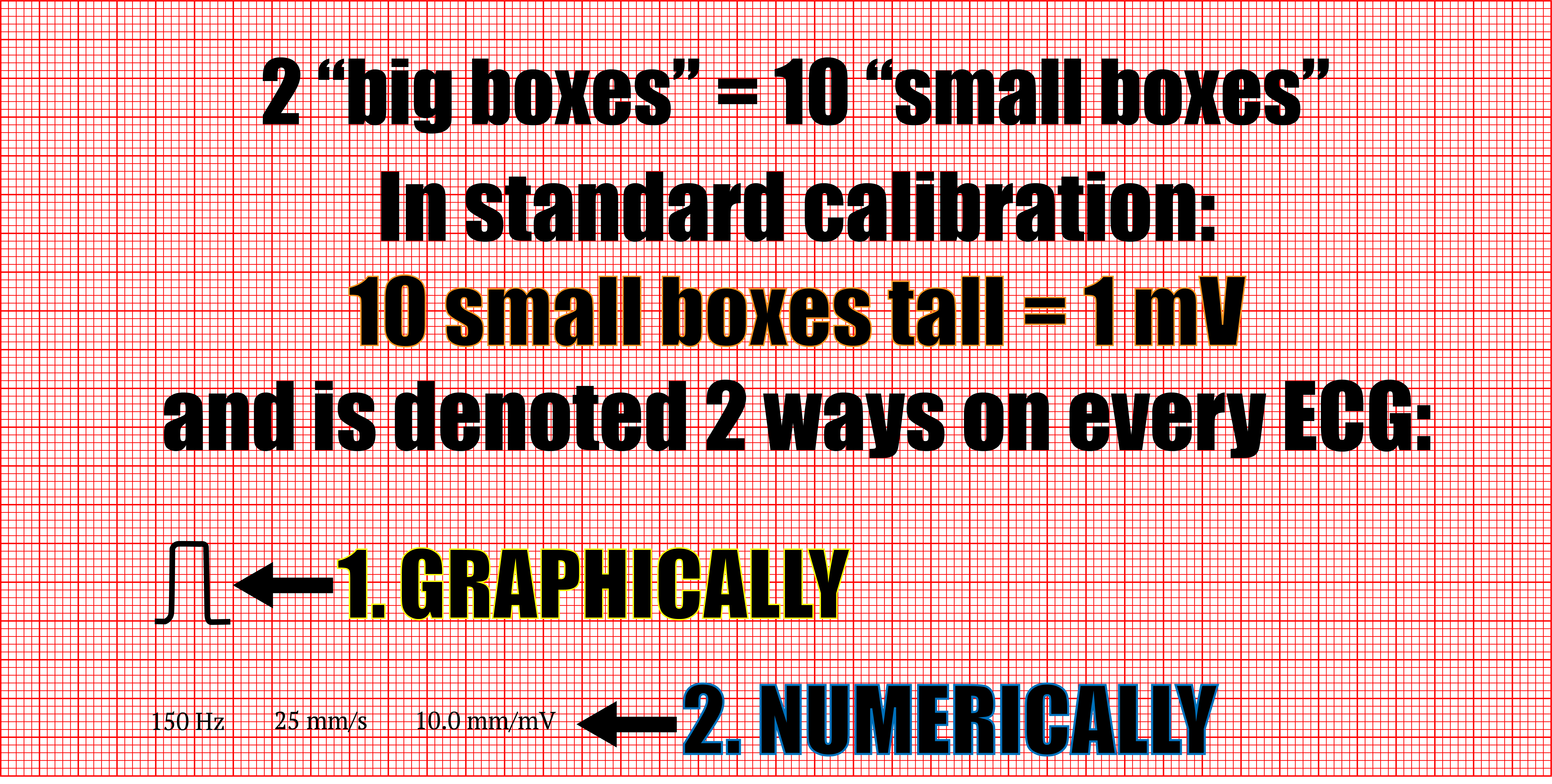 The thing to notice is the calibration setting. Standard calibration is that each small red line on the paper (they are 1 mm apart) equals 0.1 mV. So, 10 lines (two “big boxes”) is 1 mV.