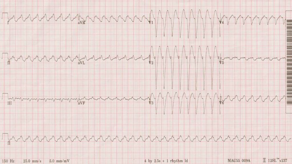 This is the other case with the same problem. Besides the rhythm disturbance, what’s unusual about this ECG?