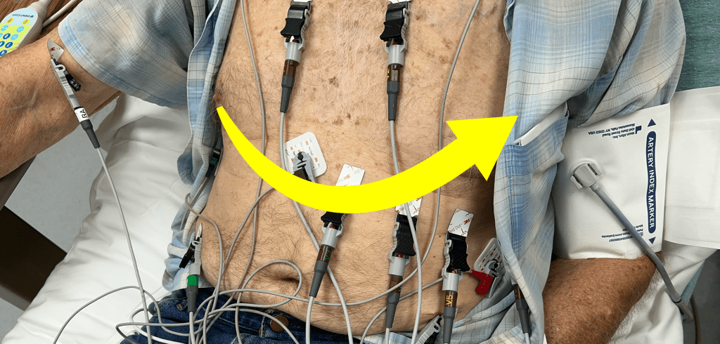 The above image was borrowed from Life in the Fast Lane and shows positioning of the electrodes in positions close to those described in the paper above. I say “close” because in this diagram, V4, V5, and V6 actually follow the 5th intercostal space rather than the “horizontal plane of V4”. The AHA/ACC/HRS paper quoted above actually acknowledges that there is “some residual disagreement” about which is the best place for those three leads. It describes the positioning in the image above (all three leads in the 5th intercostal space) as “an early recommendation” and implies that it is outdated. Now, that it some high level minutia – even to me.