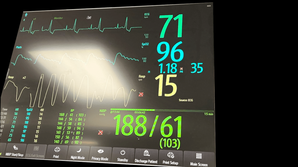 You may not spend much time thinking about it, but this monitor actually reports the heart rate in two ways. The rate is 71 as noted above based on the telemetry reading. However, the pulse oximeter reading (whose graphic representation is termed the “photoplethysmograph” or “pleth” for short) also reports a heart rate. In this case it reports 35 beats per minute.