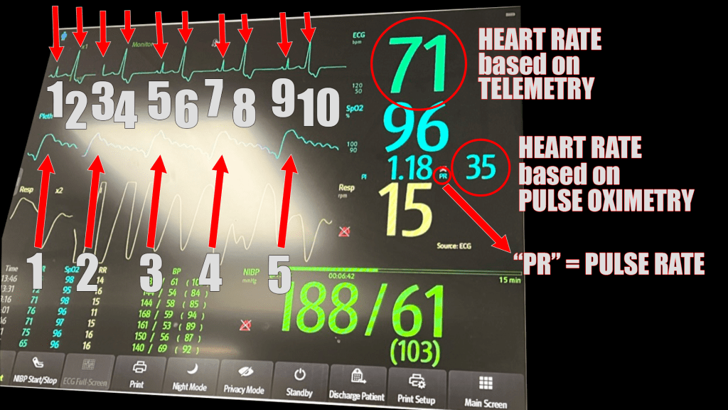 The pulse oximeter, on the other hand, detects instances of pulsatile flow. It is detecting what you would feel with your fingers if you were to check a pulse in the radial artery, for example. The display shows that on the “pleth” we see see there are five beats detected – exactly half of the 10 QRS complexes detected on telemetry.
