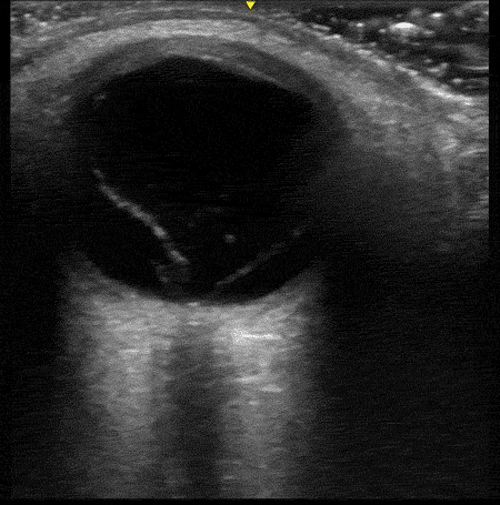 [You can tell the gain is set very differently here than the clip with vitreous detachment because of how bright the image is. It is particularly noticeable in the part of the image deep to the globe due to an ultrasound artifact called “posterior acoustic enhancement”; but I digress.]