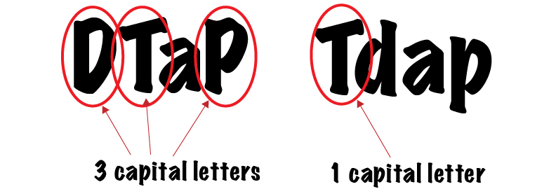 The three capital letters in DTaP represent the fact that it has full doses of all of three components. Tdap, on the other hand, only has a capital T, which represents the full doses of tetanus toxoid. It has lower case d and p, however, representing lower concentrations of the diphtheria toxoid and acellular pertussis antigens.