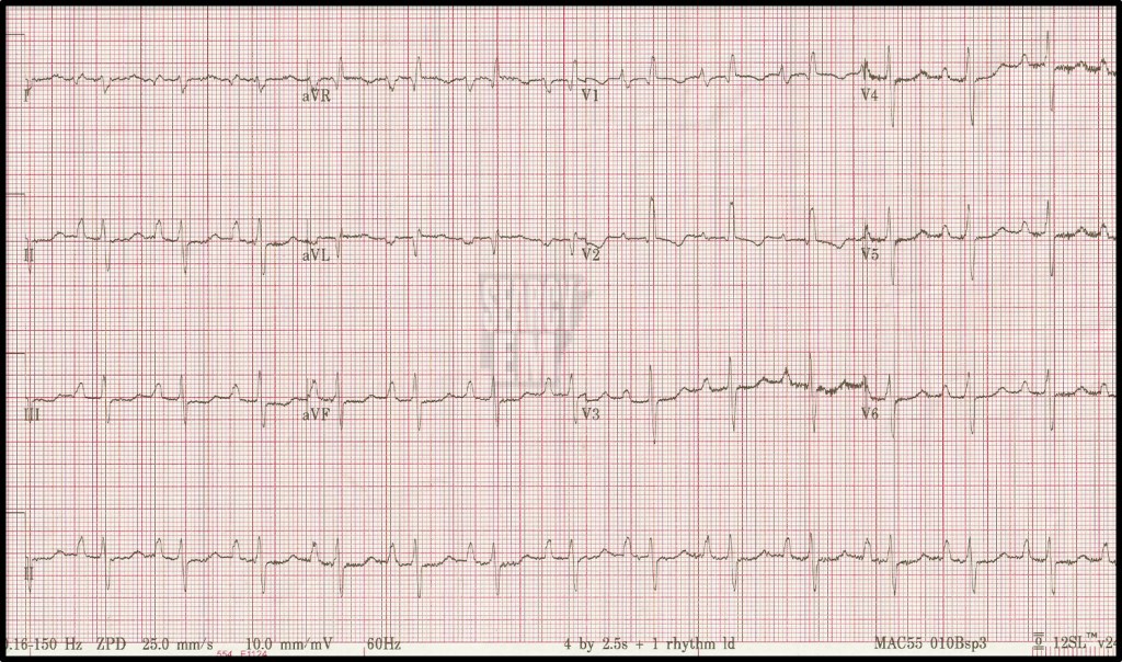 It shows sinus rhythm at rate of 78 bets per minute, extreme axis deviation (Northwest axis), no acute ischemic changes, poor R wave progression, but it is most noteworthy for the very tall P waves (at least 4 mm) in lead II. (Recall that normal is less than 2.5 mm.) This is called P pulmonale and is caused by right sided heart disease (pulmonary hypertension, COPD, tricuspid steonsis, etc.)