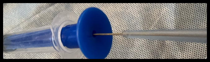 This blunt tipped needle is designed to be placed into the hole on the back of the plunger of the Raulerson syringe. Doing so deactivates the valve mechanism and allows blood to flow though the needle and out the back of syringe in an open manner.