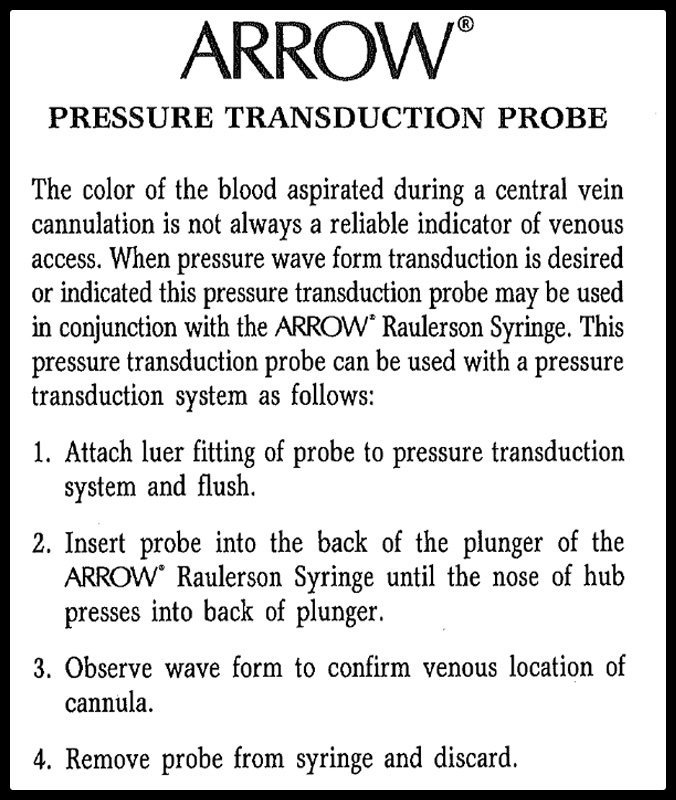 The transaction probe and extension tubing give you some options for confirming venous placement when the Raulerson syringe was used for access. In the era of ultrasound guidance, we rarely need other methods for confirmation. In my experience, it is simpler to remove the syringe from the needle and check the pulsatility of the flow than to attach these extra contraptions to the syringe. However, this is matter of personal preference and the transduction probe and extension tubing are perfectly valid options.