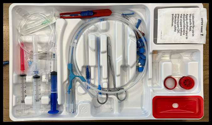 Here is a standard central venous line insertion kit. There are some things in it that we (or at least “I”) truly never use, and I suspect some folks do not even know what they are for. Let’s have a look.
