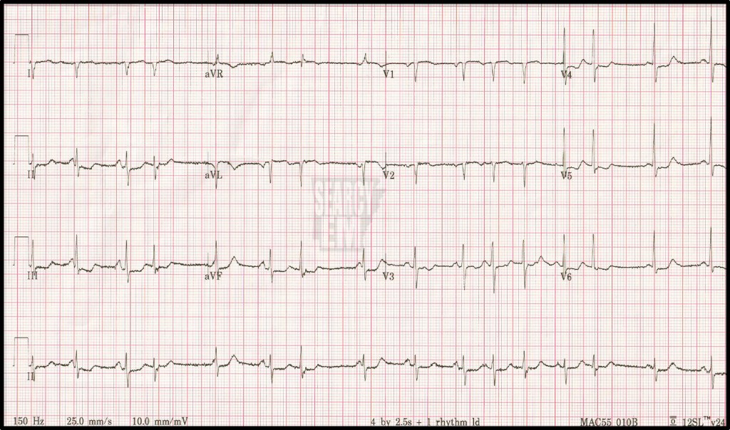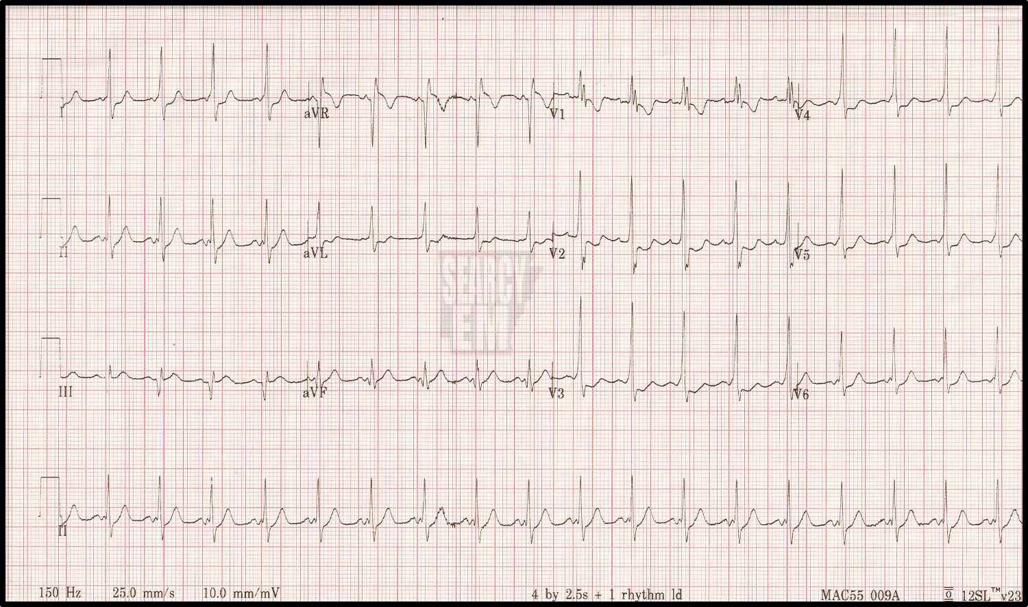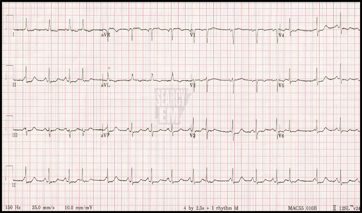 Normal sinus with PAC’s. the finding is how tall the P waves are in lead II. They are uniphasic. Since the right atrium depolarizes before the left, tall uniphasic P waves in lead II are caused by hypertophy of the right atrium. (Biphasic P waves are caused by left atrial enlargement). Right atrial enlargement is likely due to pathology of the tricuspid valve or high RV pressures, which themselves are usually due to high pulmonary aretery pressures.