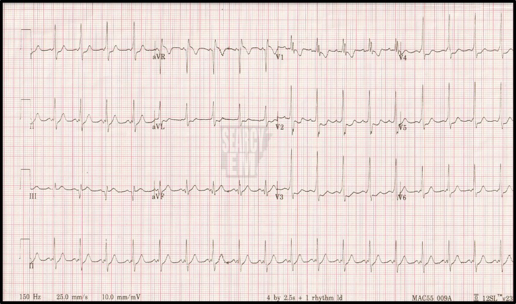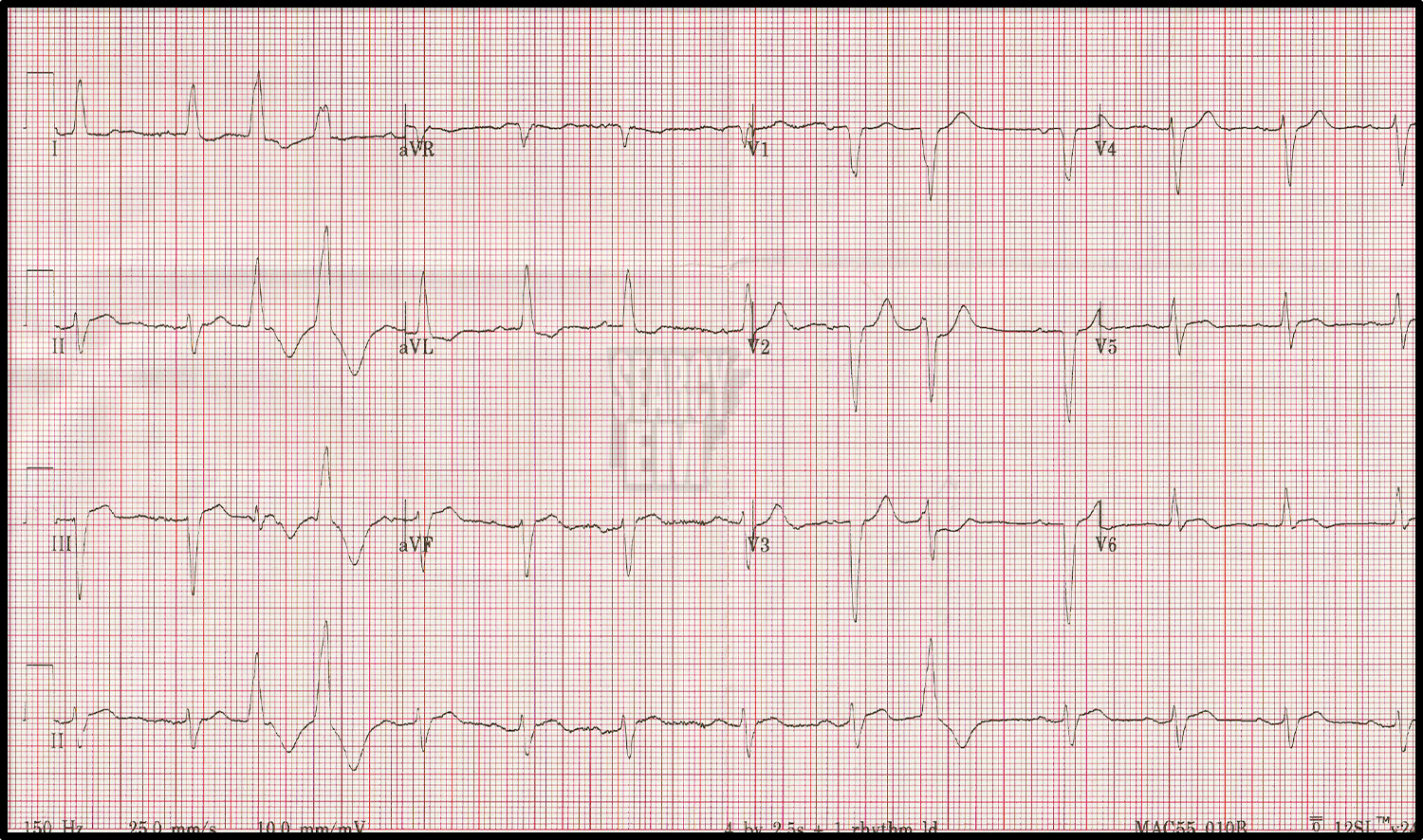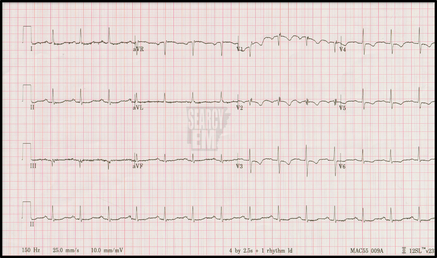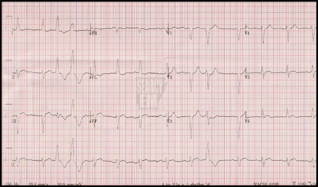 Normal sinus with PAC’s. the finding is how tall the P waves are in lead II. They are uniphasic. Since the right atrium depolarizes before the left, tall uniphasic P waves in lead II are caused by hypertophy of the right atrium. (Biphasic P waves are caused by left atrial enlargement). Right atrial enlargement is likely due to pathology of the tricuspid valve or high RV pressures, which themselves are usually due to high pulmonary aretery pressures.