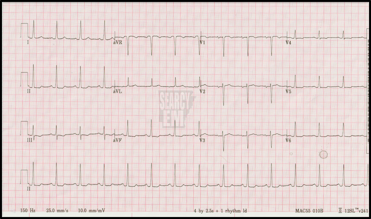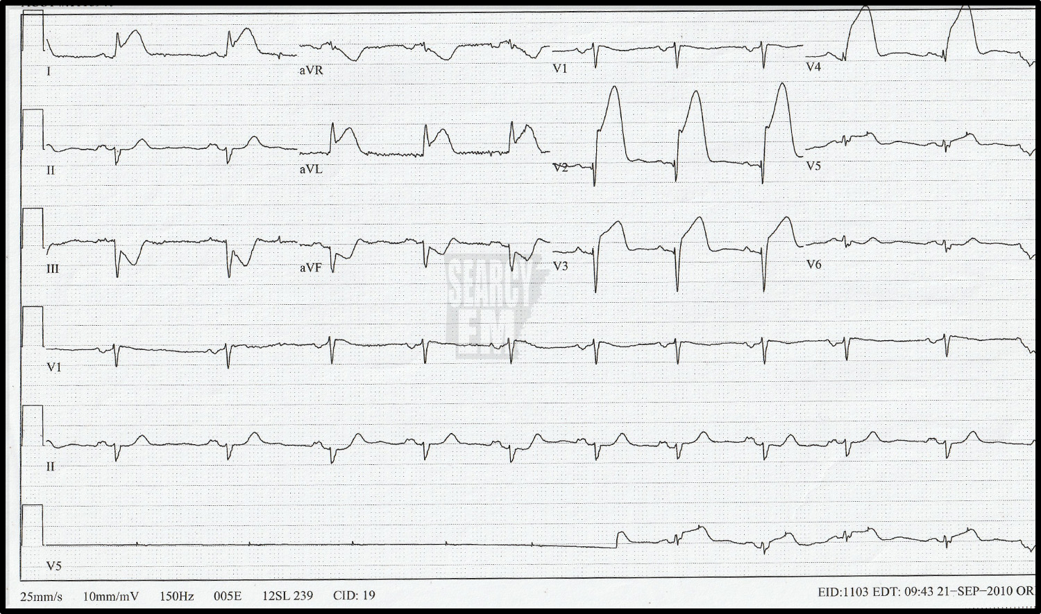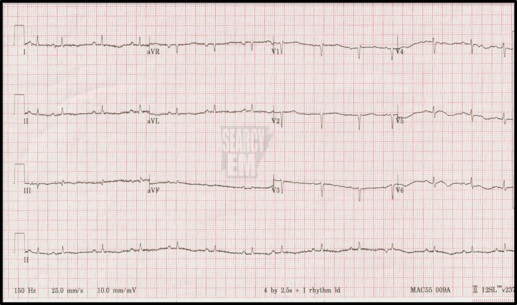STE in the anterior and lateral leads with reciprocal depression in the inferior leads. Of note, there is no elevation in V3. The only explanation is lead malpositioning. Unfortunately it is common to see lead V3 placed to the patient’s right of V2, that must be what happened here.