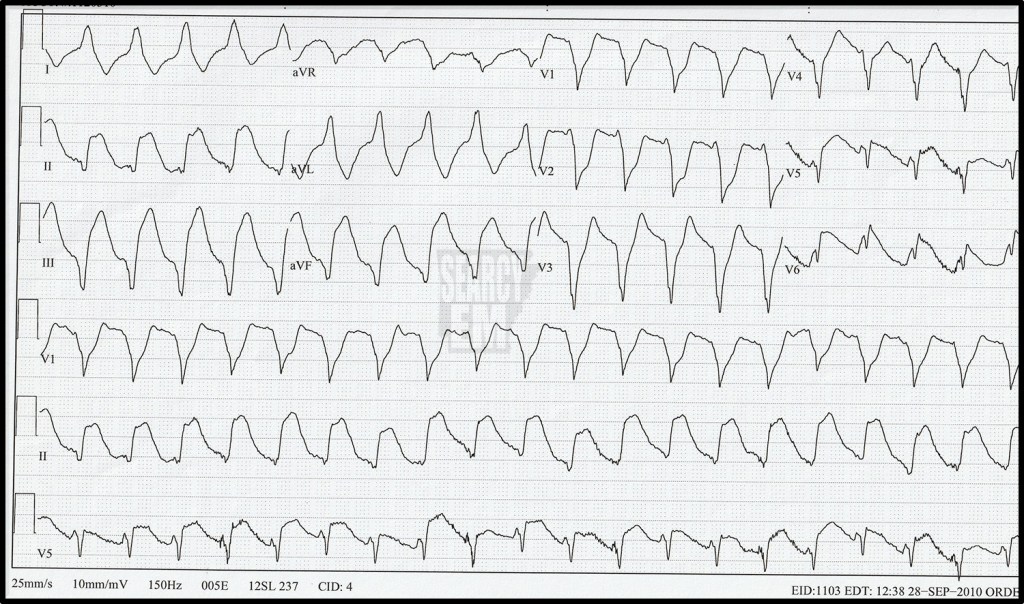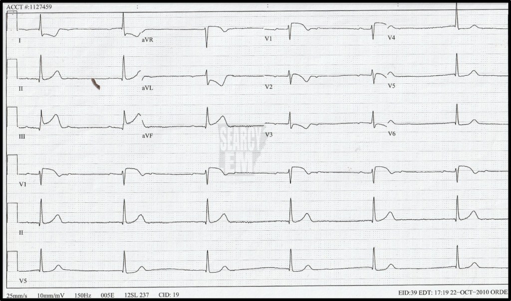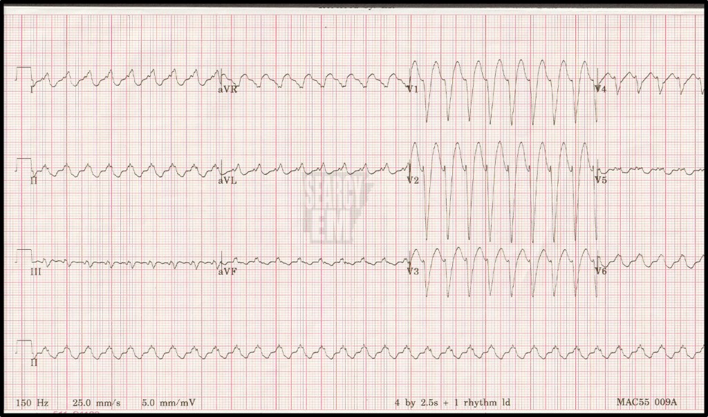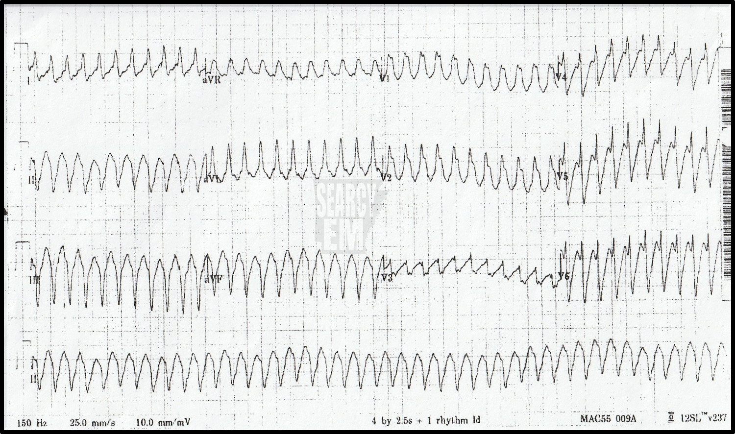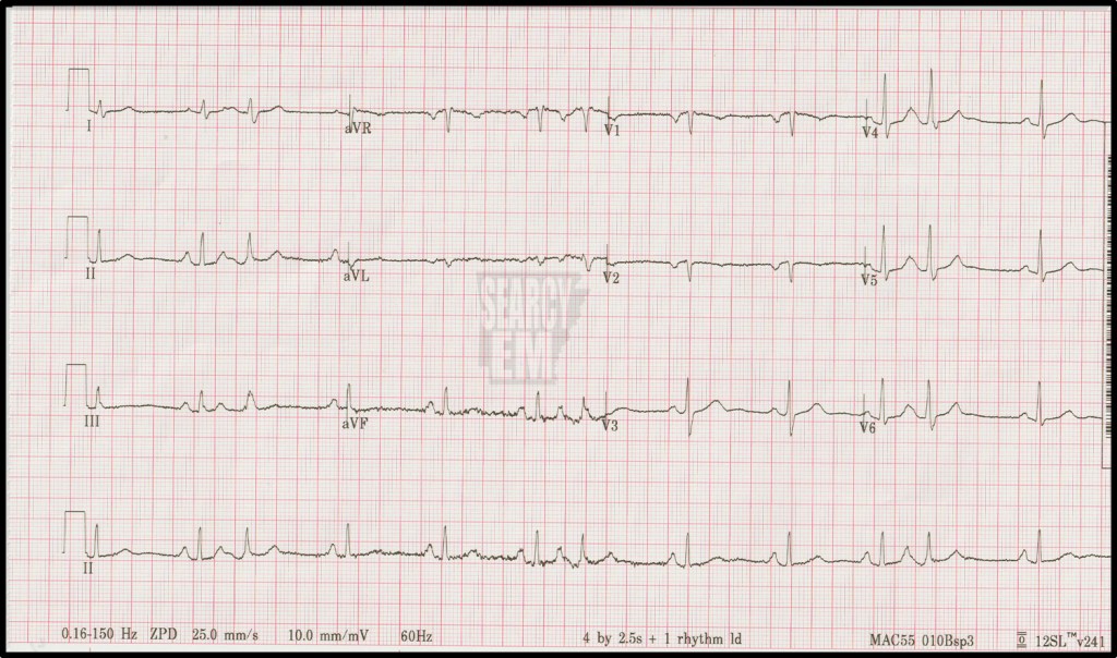 This is the same patient as in the prior ECG after cardioversion. Notice the prominent delta waves in V3, V4, and V5 along with the short PR interval. This is WPW, which makes the prior ECG likely to be antidromic SVT.