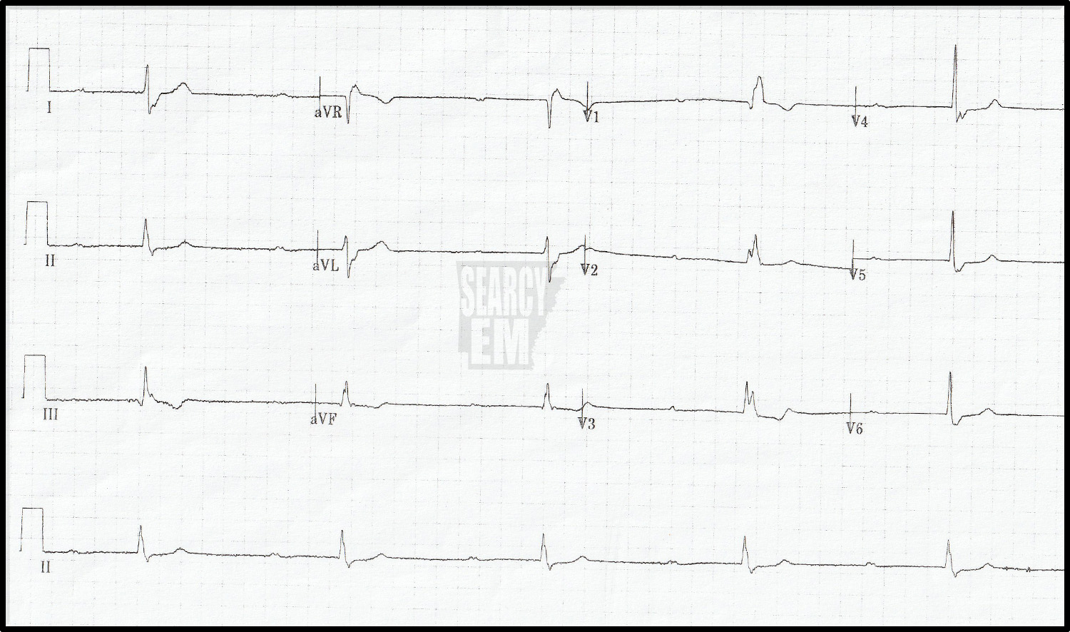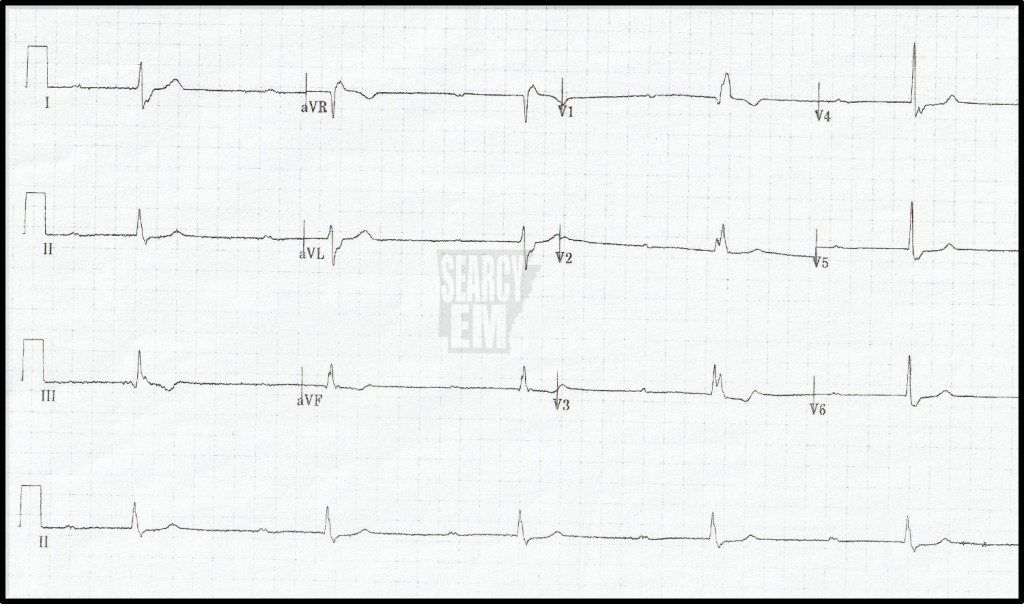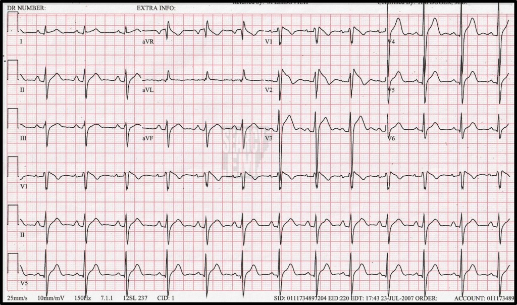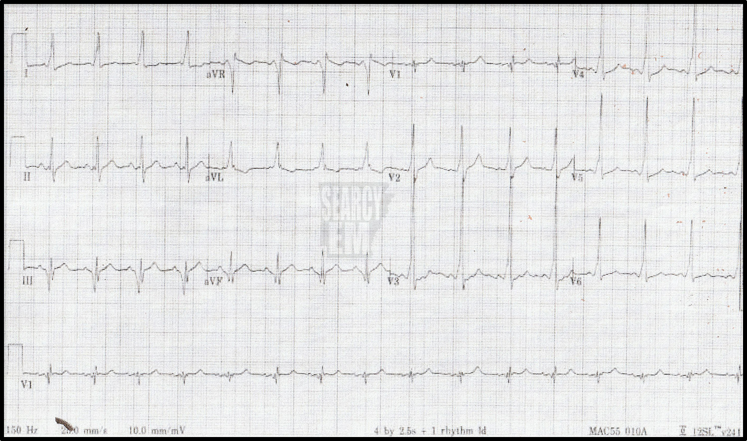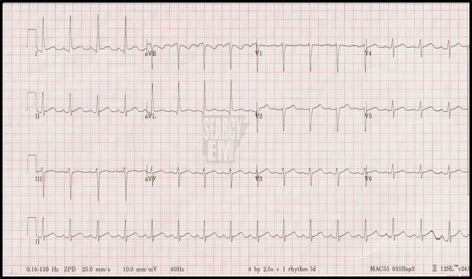 The same patient as EKG 35. In this tracing, leads V4, V5, and V6 have been moved to positions V7, V8, and V9. The depression remains in the anterior leads (V2, V3), but now we see ST elevation in leads V7-V9). This is a posterior STEMI. You can see that the leads 7, 8, and 9 were hand written in on the tracing as the machine does not know that the leads were moved.