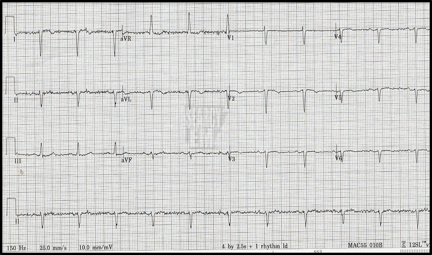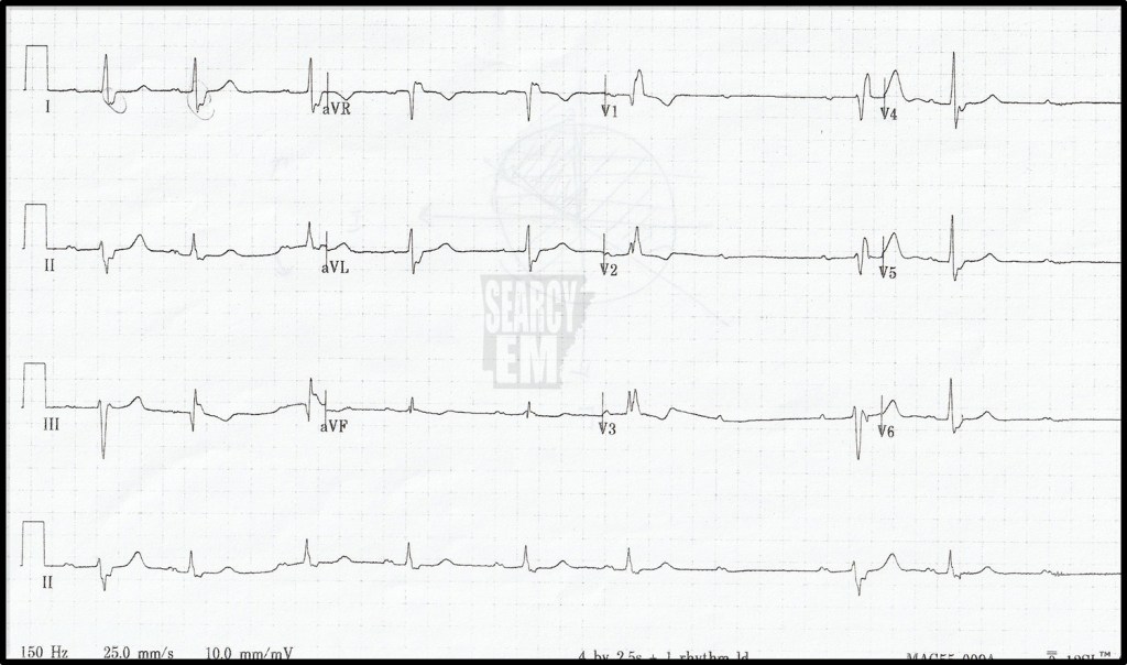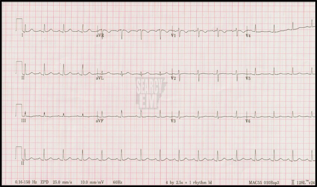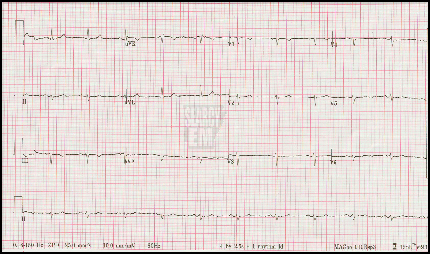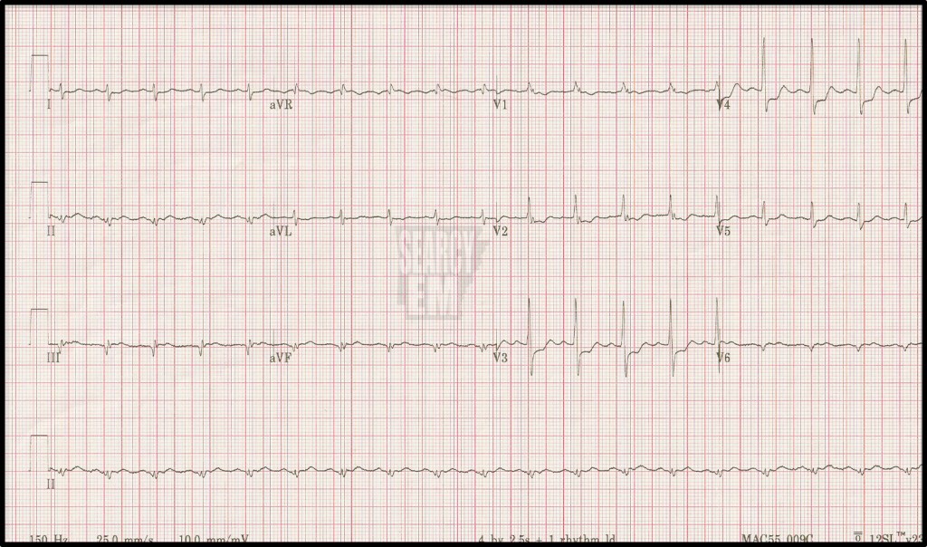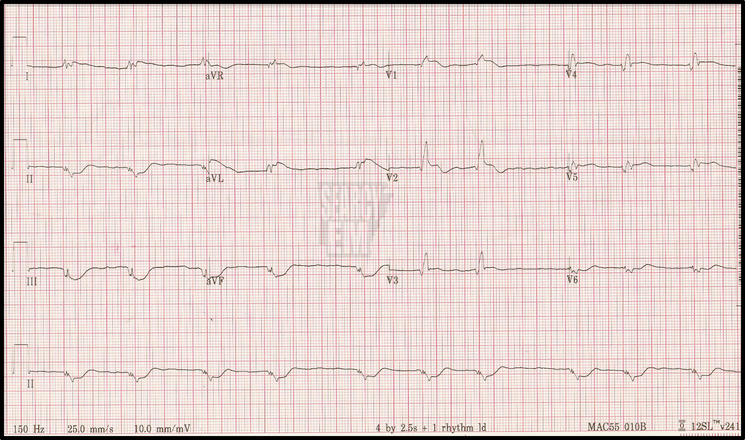 The same patient as EKG 35. In this tracing, leads V4, V5, and V6 have been moved to positions V7, V8, and V9. The depression remains in the anterior leads (V2, V3), but now we see ST elevation in leads V7-V9). This is a posterior STEMI. You can see that the leads 7, 8, and 9 were hand written in on the tracing as the machine does not know that the leads were moved.