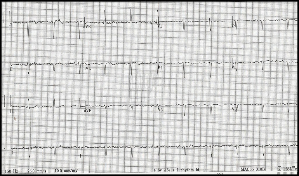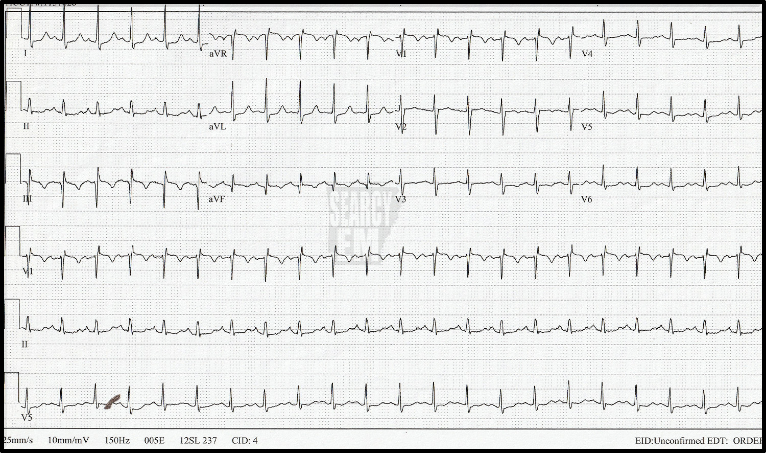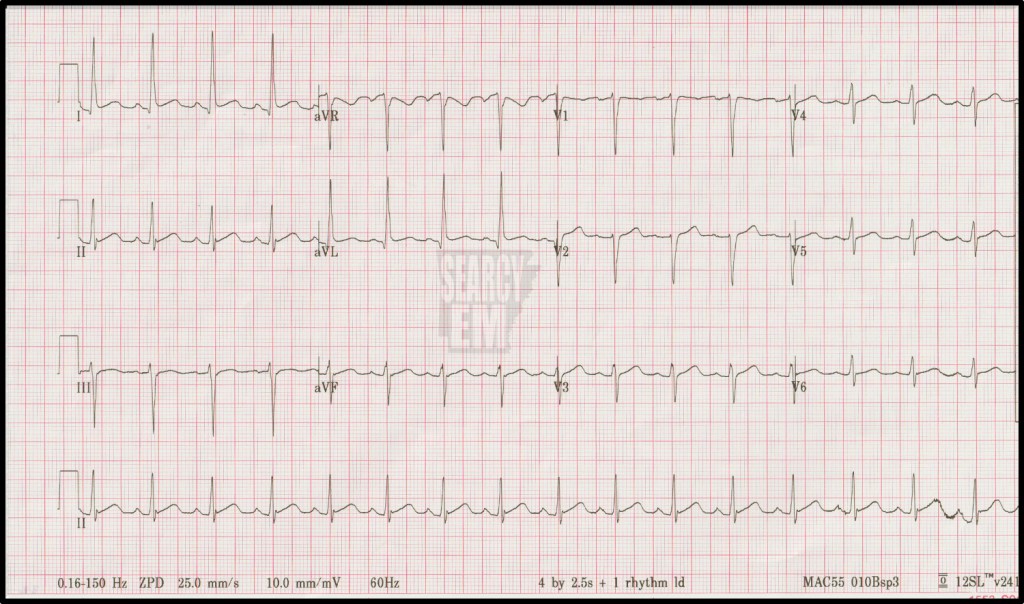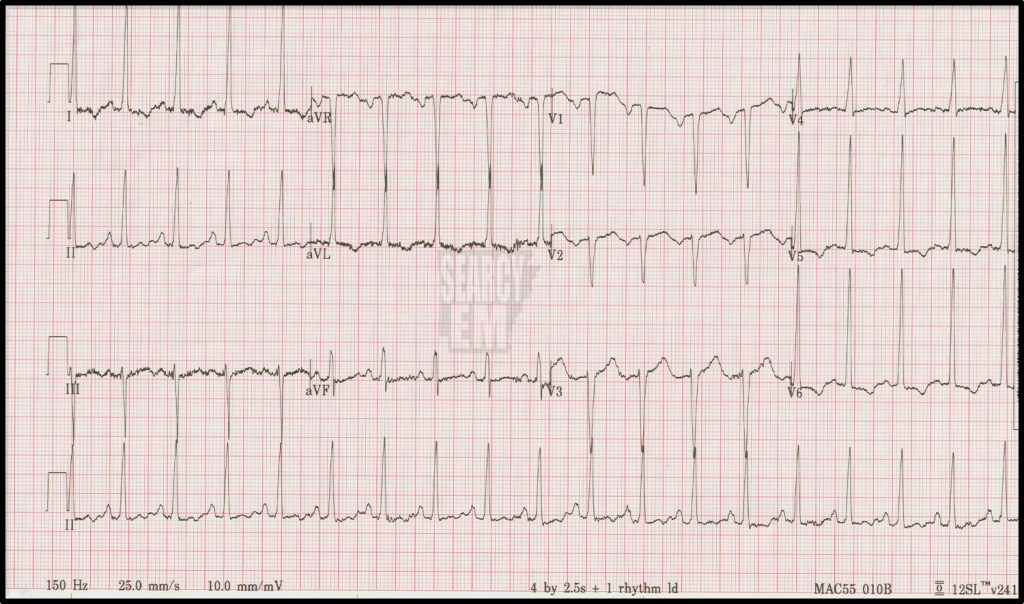Sinus tachycardia with ST depression in V2-V4. Concerning for anterior ischemia vs posterior infarction.