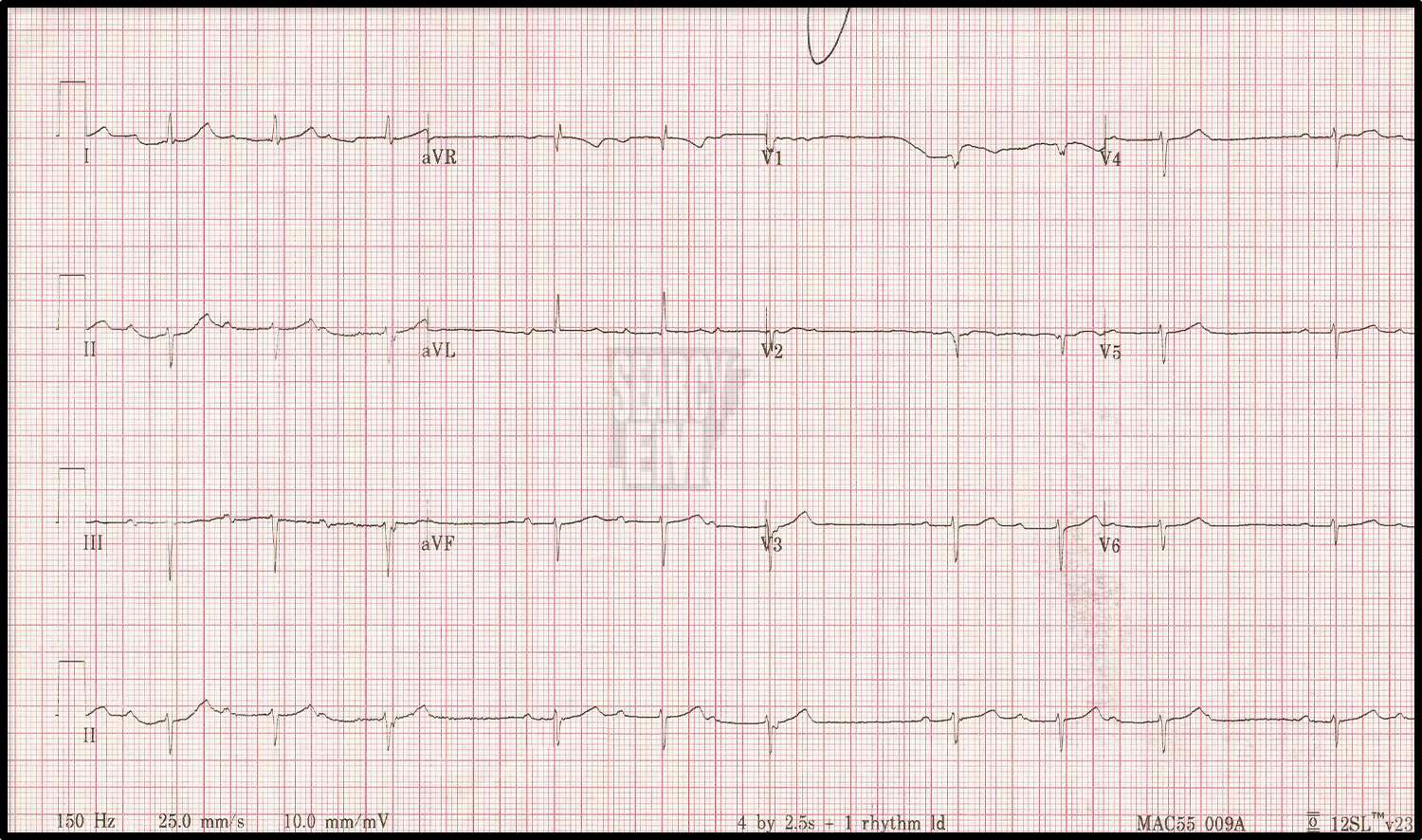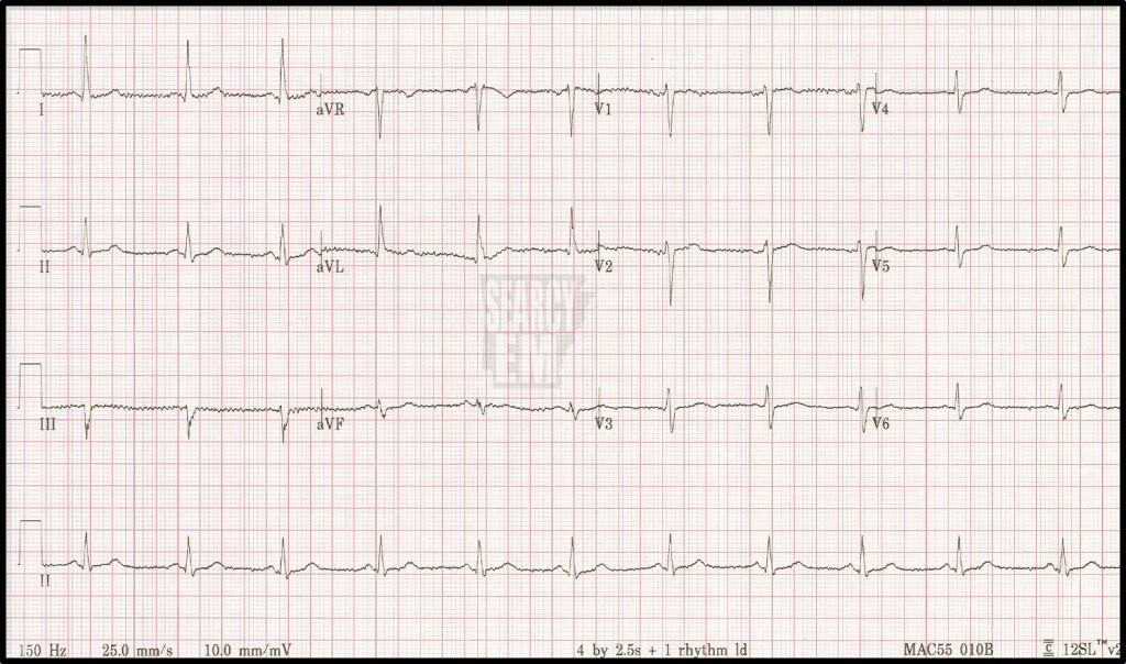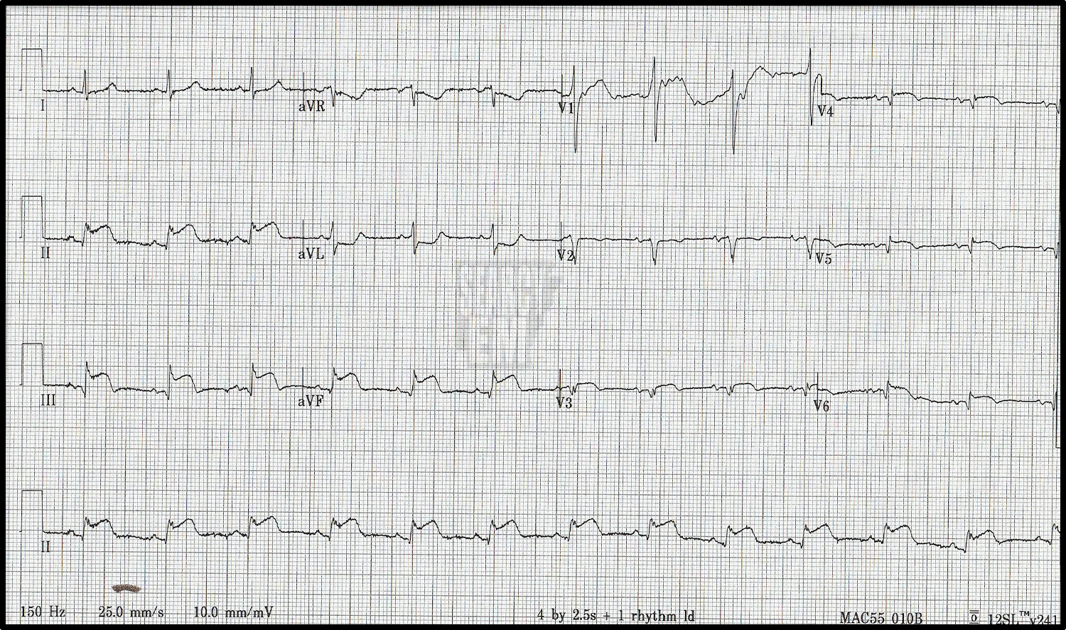 Sinus with ST depression in the anterior leads. Concerning for anterior ischemia vs posterior infarction.