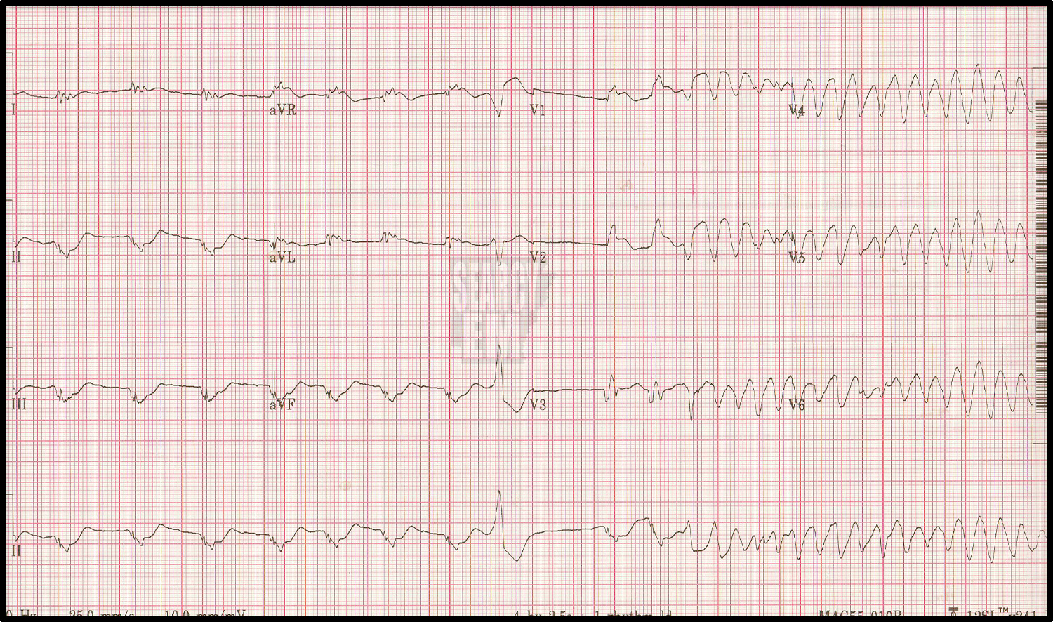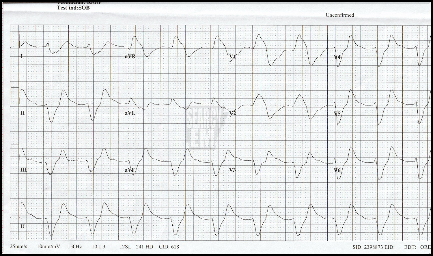 Same patient as EKG 67. in this tracing, we happen to catch them going into VT. It looks like polymorphic VT in this short segment, but in a longer stretch is may ‘settle’ into monomorphic VT.
