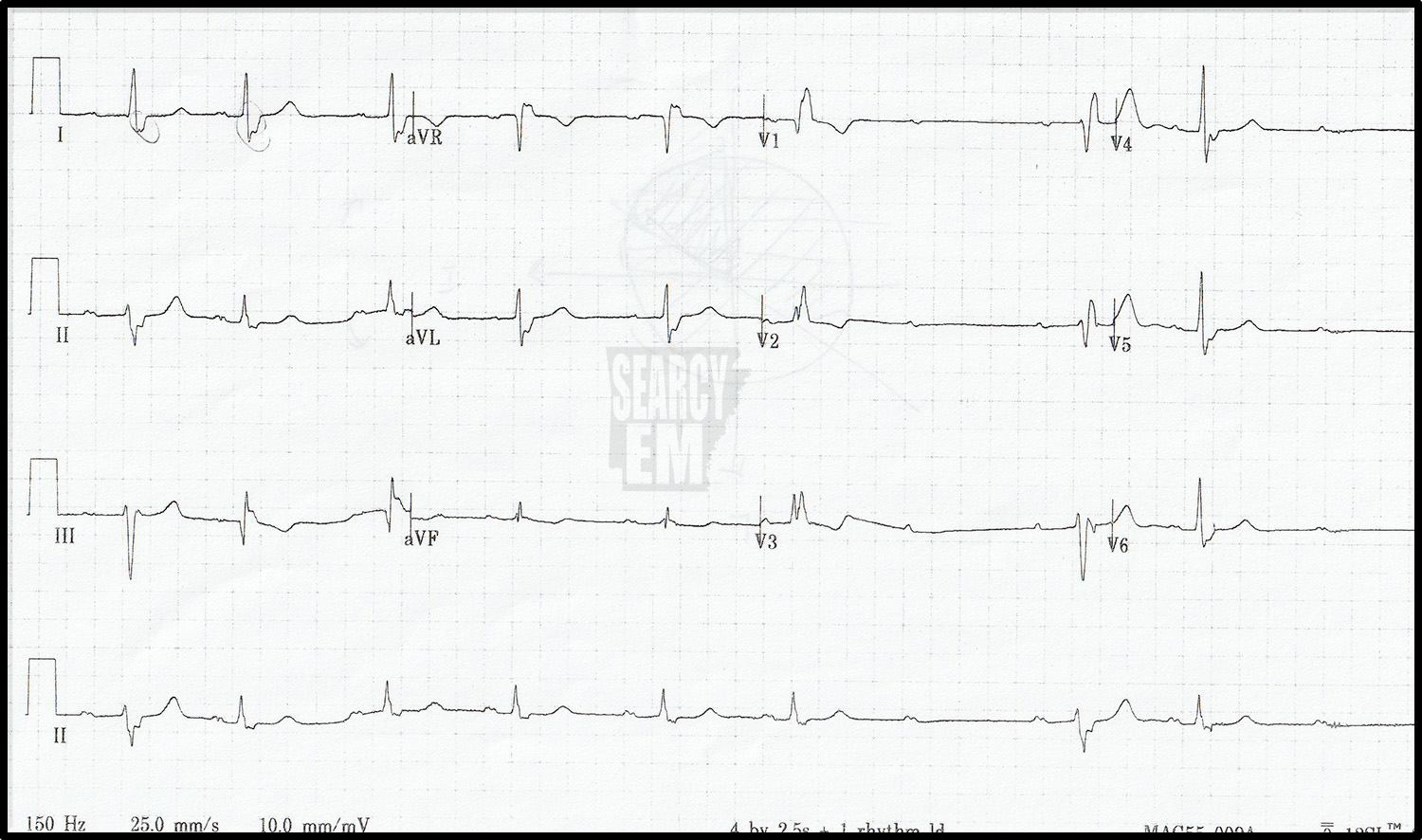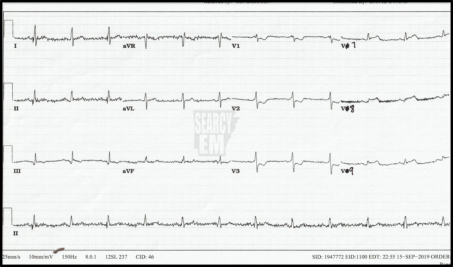 The same patient as EKG 57. In this tracing, leads V4, V5, and V6 have been moved to positions V7, V8, and V9. The depression remains in the anterior leads (V2, V3), but now we see ST elevation in leads V7-V9). This is a posterior STEMI. You can see that the leads 7, 8, and 9 were hand written in on the tracing as the machine does not know that the leads were moved.