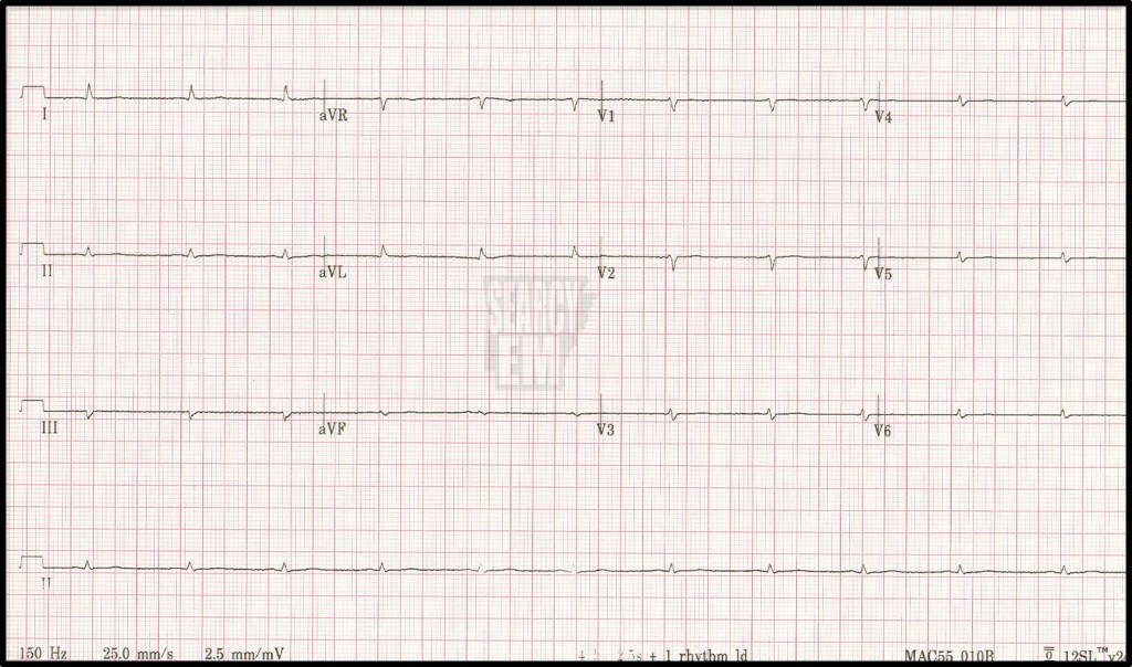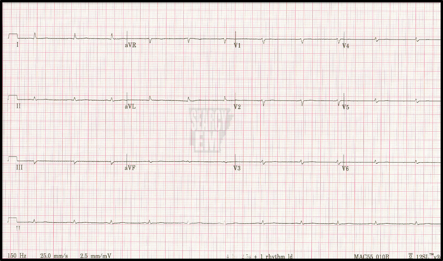 Probably a third degree AV block. It appears that the P waves are coming at the same rate as the QRS complexes, though. Could this be a sinus rhythm with a huge primary AV block? I don’t we can say for certain that it can’t be that. This is the same patient as in 38a and the QRS complexes here look exactly like the sinus QRS complexes from the 38a, which raises the possibitliy that we are seeing sinus conducted QRS complexes here (i.e. a primary AV block). The other possibility is that none of the P waves are being conducted and every other one is buried in the QRS complex and that the QRS rate just happens to be exactly half of the P wave rate. That would make this Third degree block. We would need to see a longer strip to look for some irregularity to know for sure.