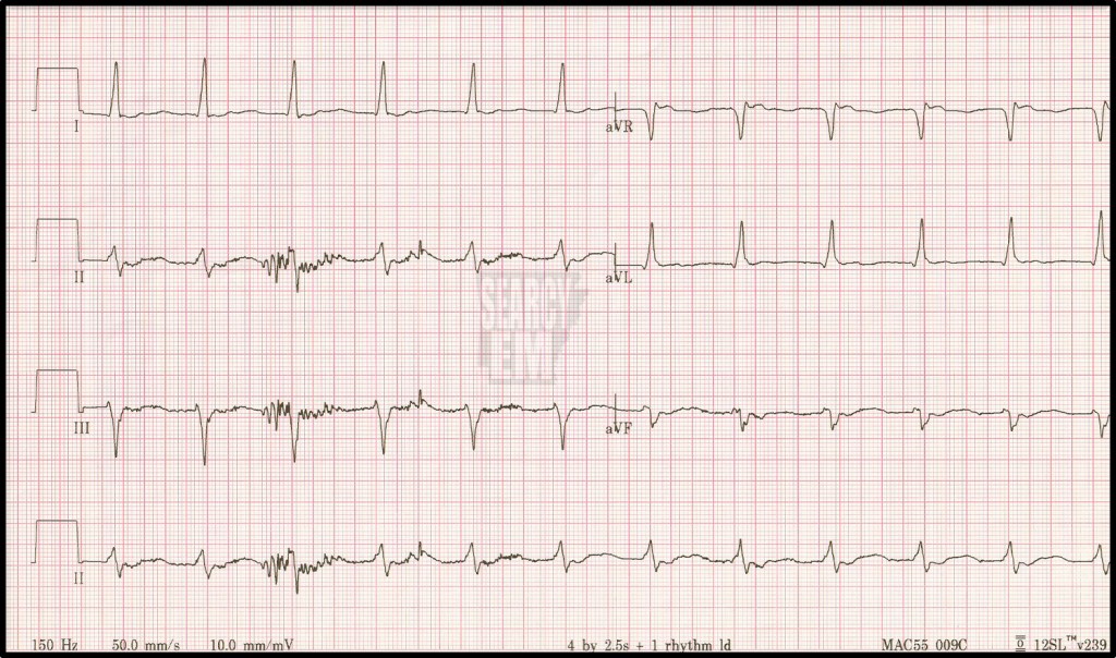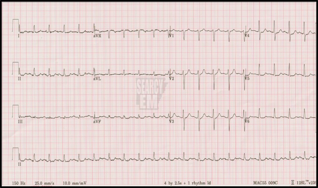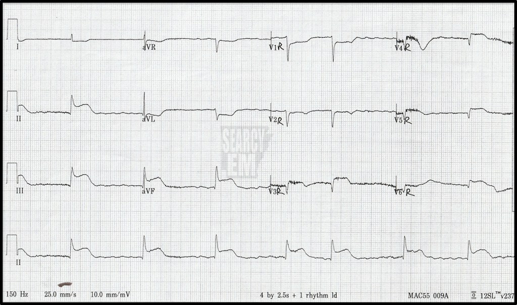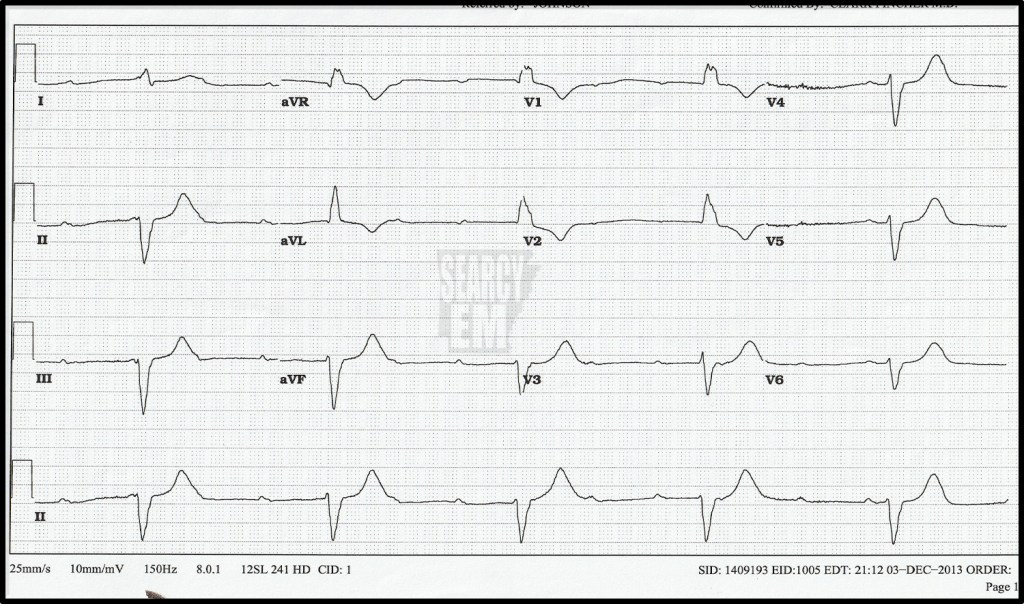 Same patient as 54. In this tracing the precordial leads (V1-6) have been turned around to the right and now represent leads V1R – V6R. We see elevation throughout these leads, but most importantly we see elevation in V4R, whihc is the most specific lead for Right Ventricular Involvement in the setting of an inferior wall MI. Of note, there was a STEMI on the first EKG. The cath lab could have been activated based on that. The right sided leads provide extra information in terms of how preload dependant the patient might be, but you wouldn’t delay going to the cath lab pending a right sided EKG. This is similar, but different to doing posterior leads in the setting of anterior ST depression. In that case, there is no “STEMI” until you see the STE in the posterior leads, so that is necessary for making the diagnosis. In this case, the diagnosis of STEMI, is already made. This is extra information.
