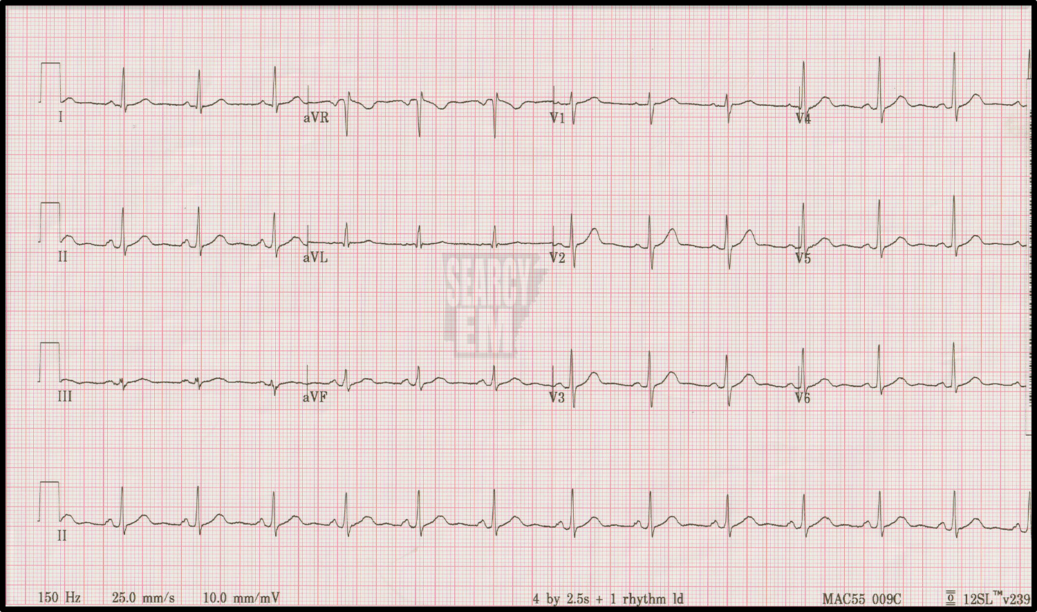 Same patient as 28. Here the Leads V4, 5, and 6 have been moved to the posterior positions (V7, 8, 9) and they do show elevation in leads V8 and V9. Notice that in this example, no one wrote the 7, 8, and 9 on the sheet, and the machine does not label the changes, so in retrospect there is no way to know that the leads had been moved to non-standard positions. If you do atypical lead positions, be sure to label them!