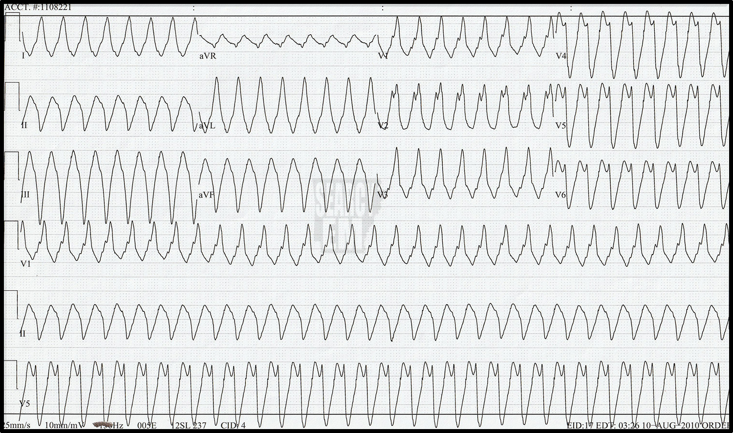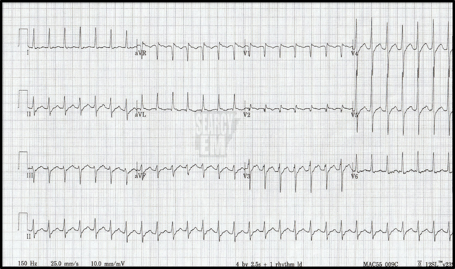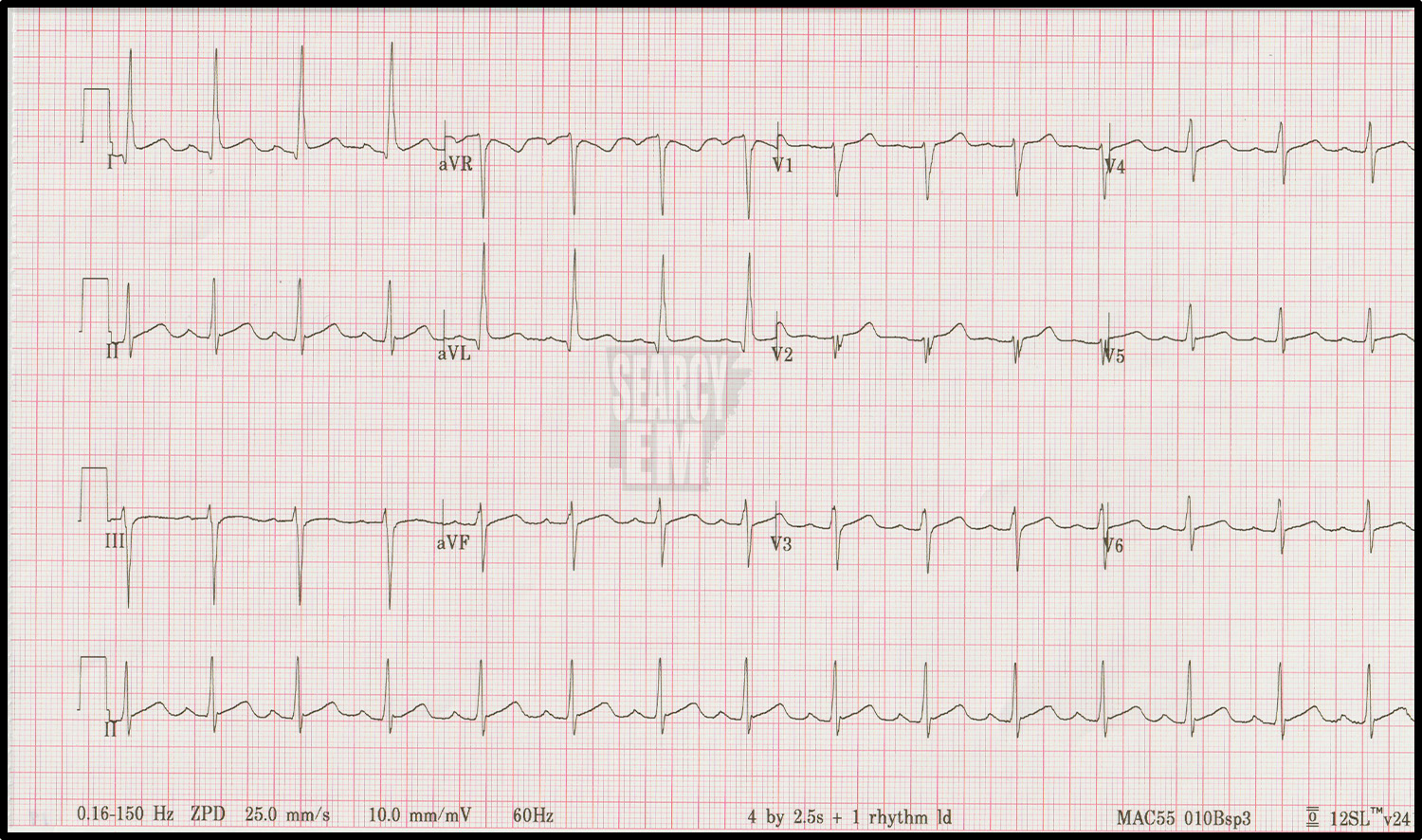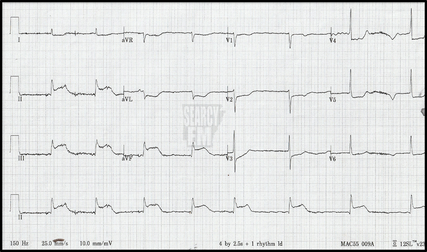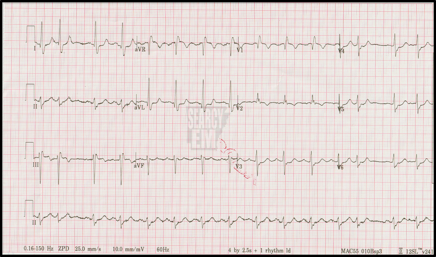 Same patient as 54. In this tracing the precordial leads (V1-6) have been turned around to the right and now represent leads V1R – V6R. We see elevation throughout these leads, but most importantly we see elevation in V4R, whihc is the most specific lead for Right Ventricular Involvement in the setting of an inferior wall MI. Of note, there was a STEMI on the first EKG. The cath lab could have been activated based on that. The right sided leads provide extra information in terms of how preload dependant the patient might be, but you wouldn’t delay going to the cath lab pending a right sided EKG. This is similar, but different to doing posterior leads in the setting of anterior ST depression. In that case, there is no “STEMI” until you see the STE in the posterior leads, so that is necessary for making the diagnosis. In this case, the diagnosis of STEMI, is already made. This is extra information.