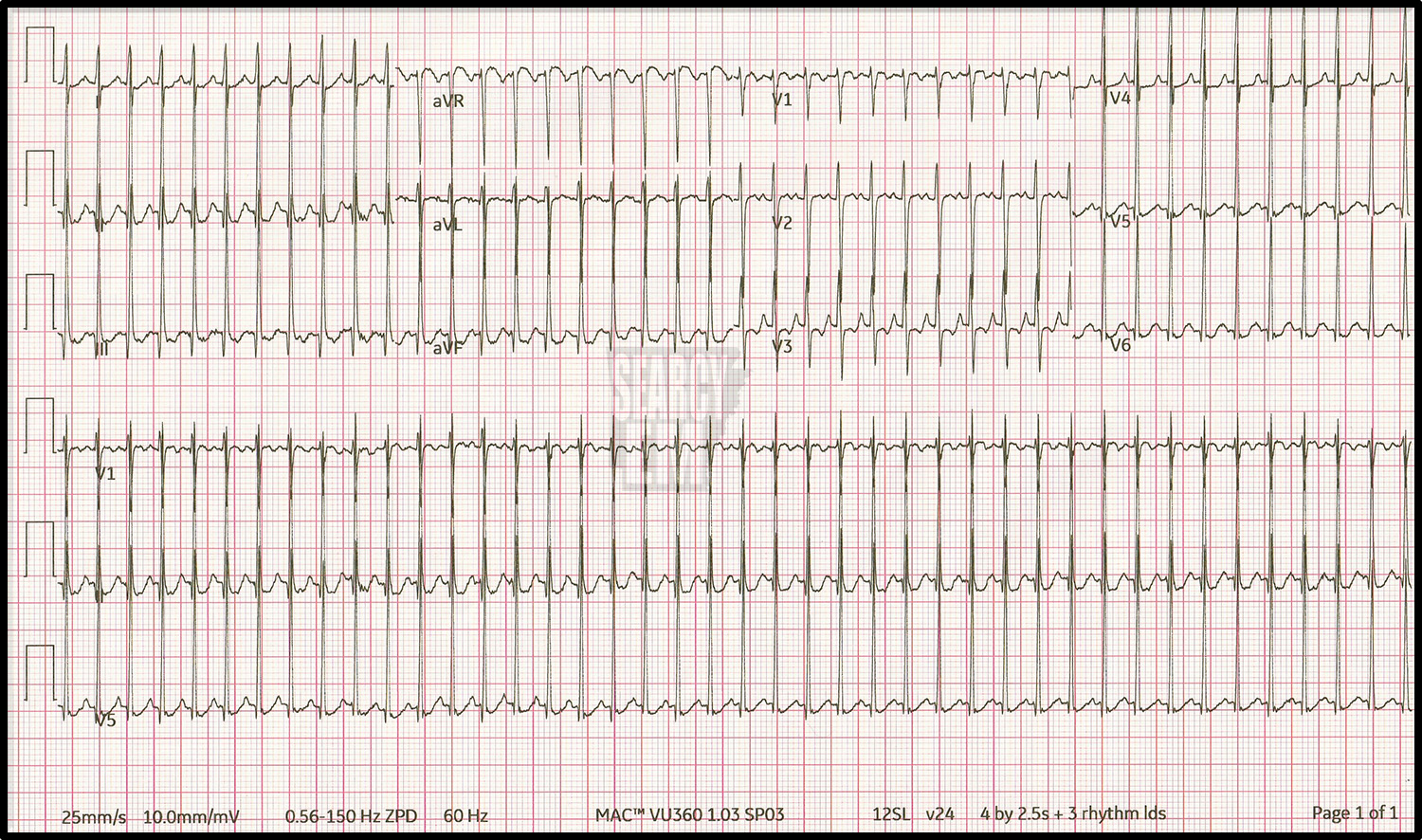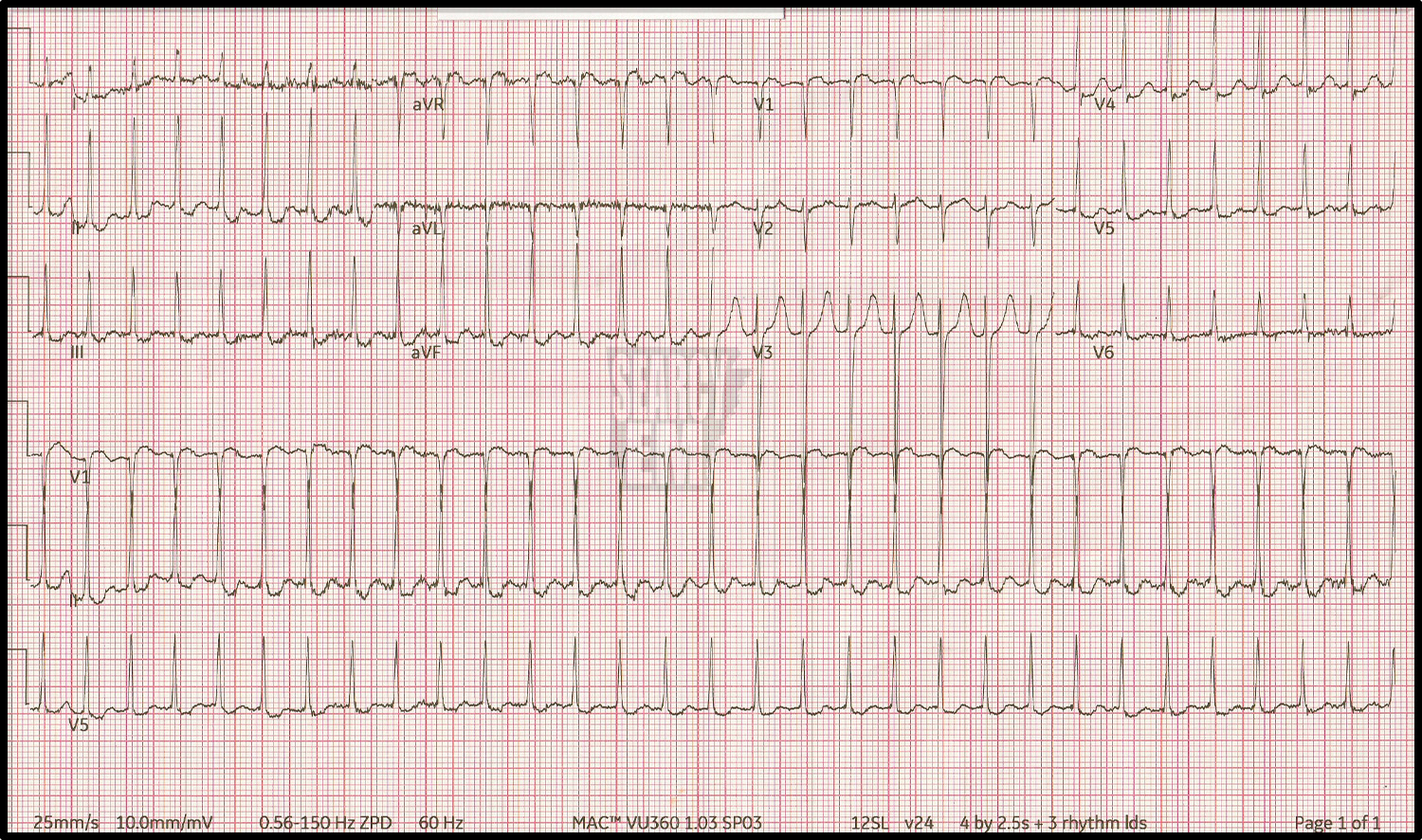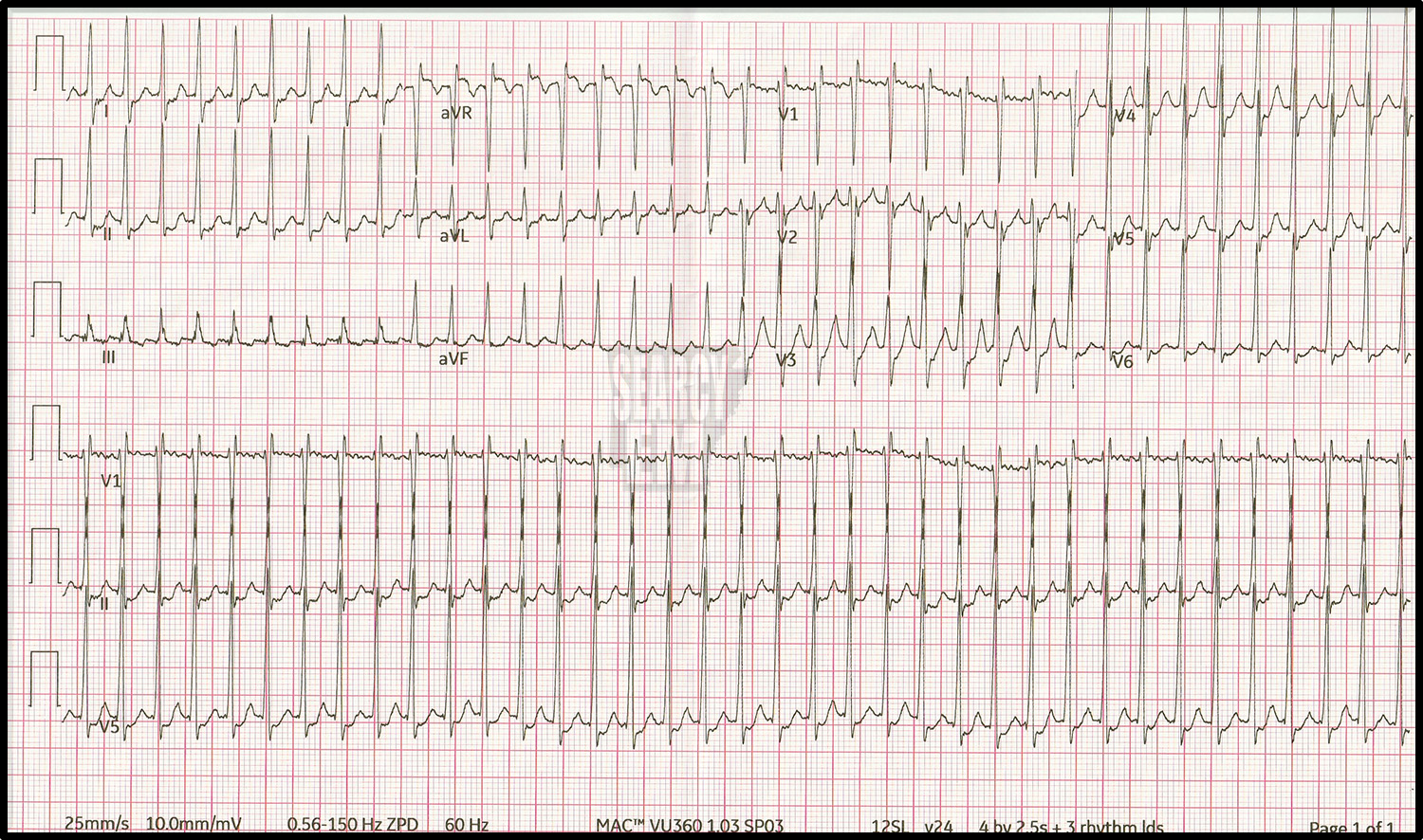 There is a very short PR here and delta waves are visible in leads V3, II, III, and aVF. Most cases of “SVT” are AV nodal re-entrant tachycardia (AVNRT). This turned out to be orthodromic SVT in the setting of undiagnosed WPW. The distinction is not important in the moment. But had the QRS complex been wide, we would have had to assume it was VT.