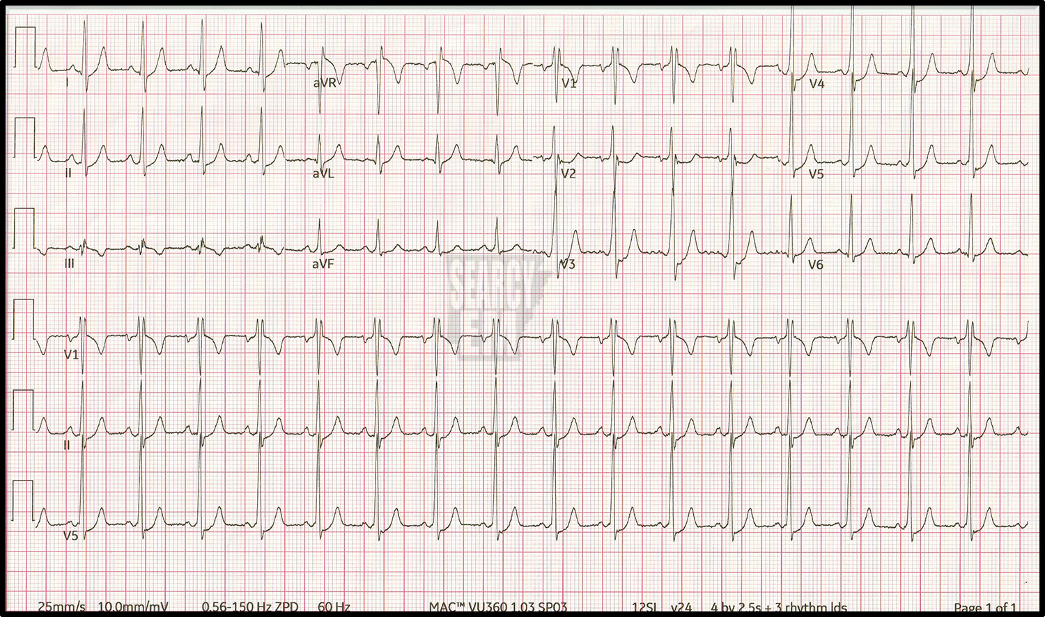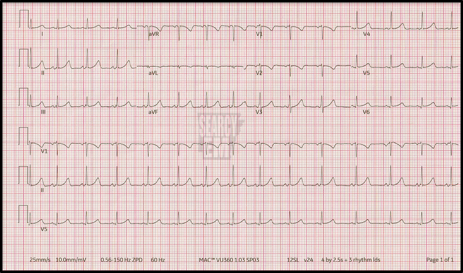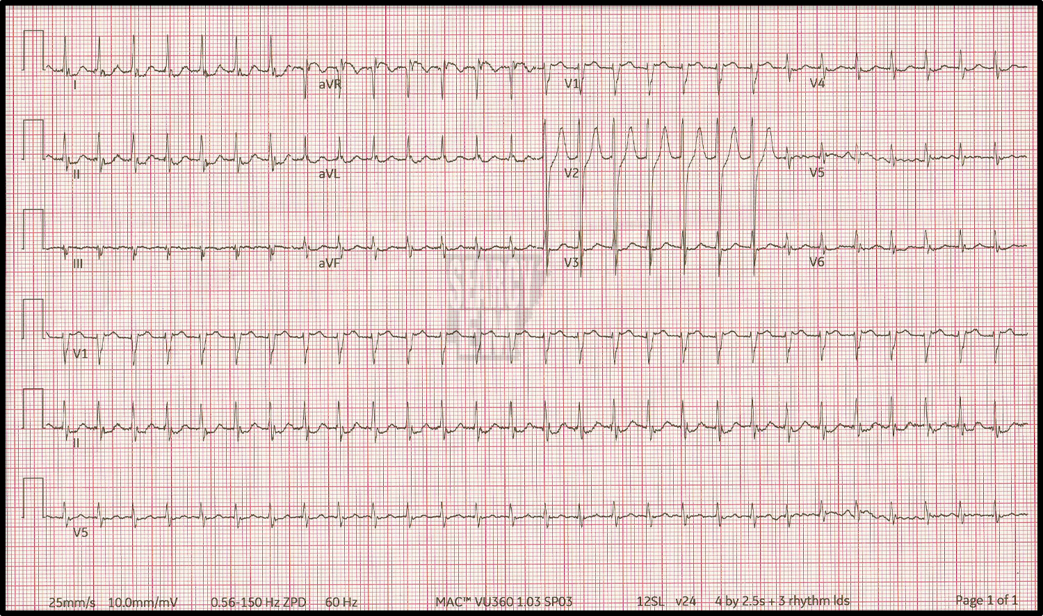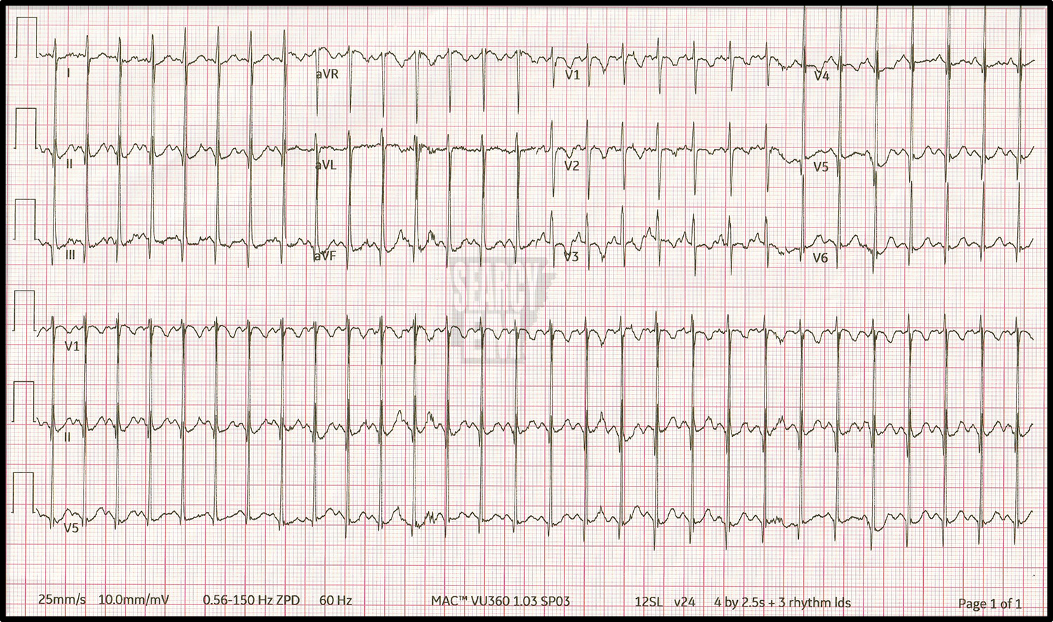 There is a very short PR here and delta waves are visible in leads V3, II, III, and aVF. Most cases of “SVT” are AV nodal re-entrant tachycardia (AVNRT). This turned out to be orthodromic SVT in the setting of undiagnosed WPW. The distinction is not important in the moment. But had the QRS complex been wide, we would have had to assume it was VT.