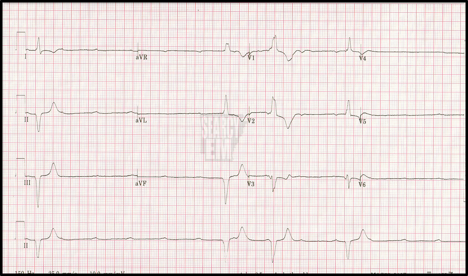 This is a tricky one. There are many non-conducted P waves, which might lead us to thinking this is a third degree block. However, there is NOT AV dissociation. In other words, the atria and ventricles are NOT moving at their own separate, but consistent paces. The P waves have their own regulare rate, but the QRS complexes do not. The QRS coplexes are not regular. They must therefore be associated with the P waves in some way, albeit it inconsistent and haphazard. If any of the P waves get conducted – as there must be because there is NOT AV discoation present – then this is a high grade second degree AV block.