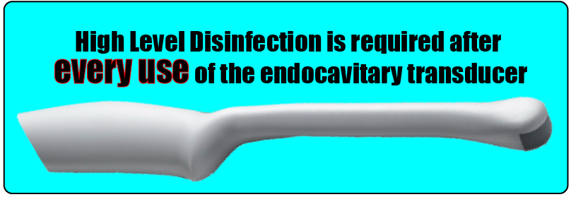- Internal transducers with mucosal contact (eg, endocavitary transducers for intra-oral or transvaginal exams and transesophageal transducers) should be covered with a single-use probe cover and undergo high-level disinfection between uses. (Our hospital uses a Trophon device for HLD.)